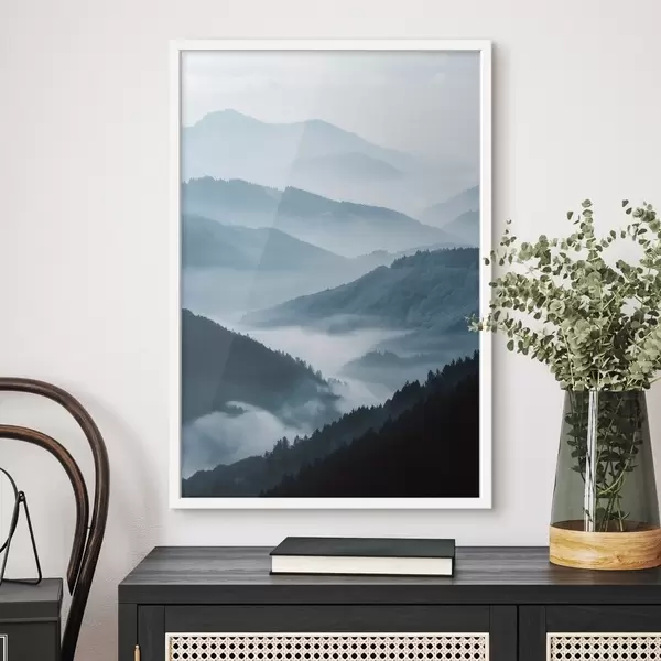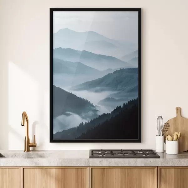 Poster Montagne avvolte nella nebbia, paesaggio blu Nr f48567