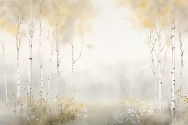 Poster Foresta di alberi slanciati nella nebbia, con tenui tonalità di luce Nr f48623