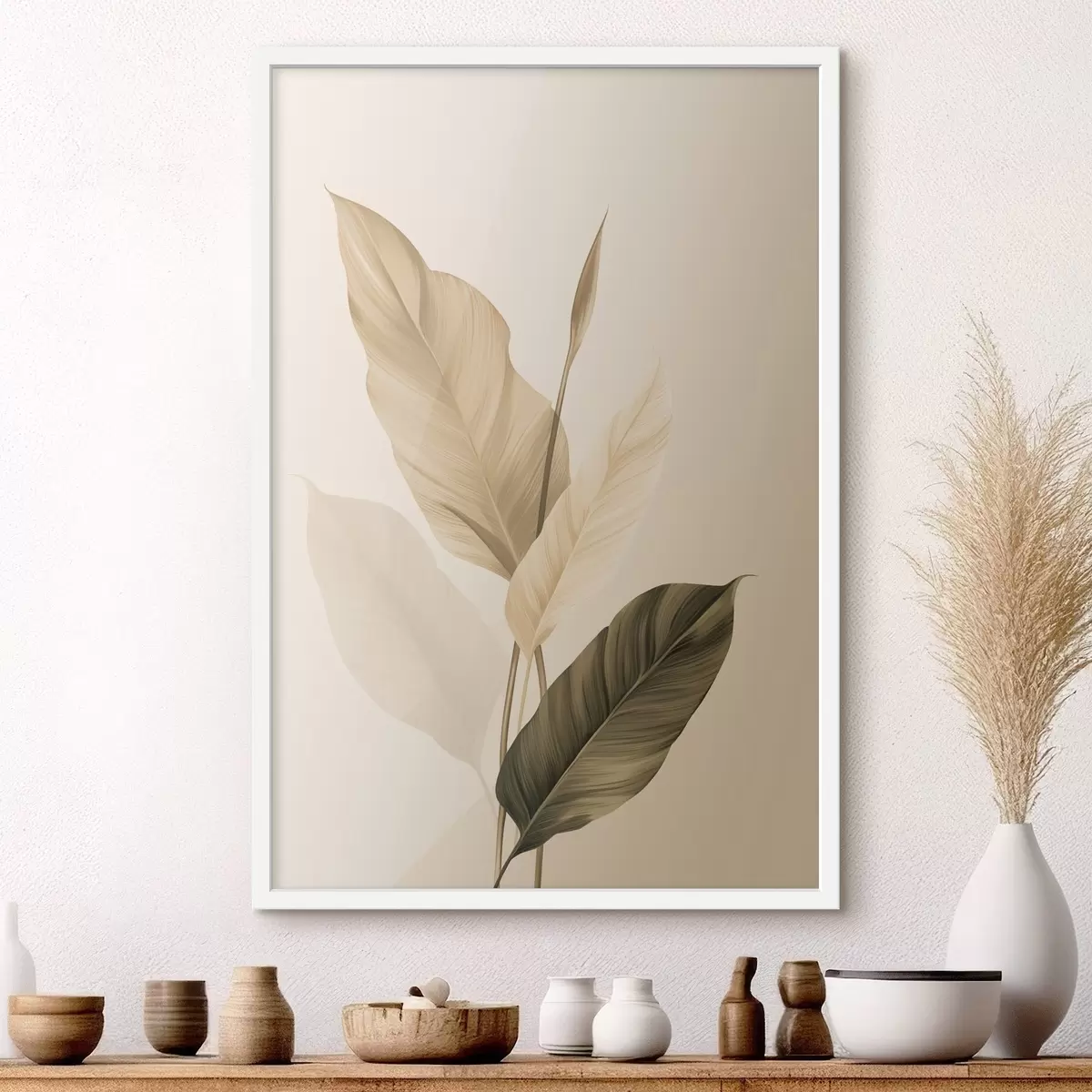 Poster Grandi foglie tropicali nei toni del beige e del marrone, su uno sfondo chiaro Nr f48725