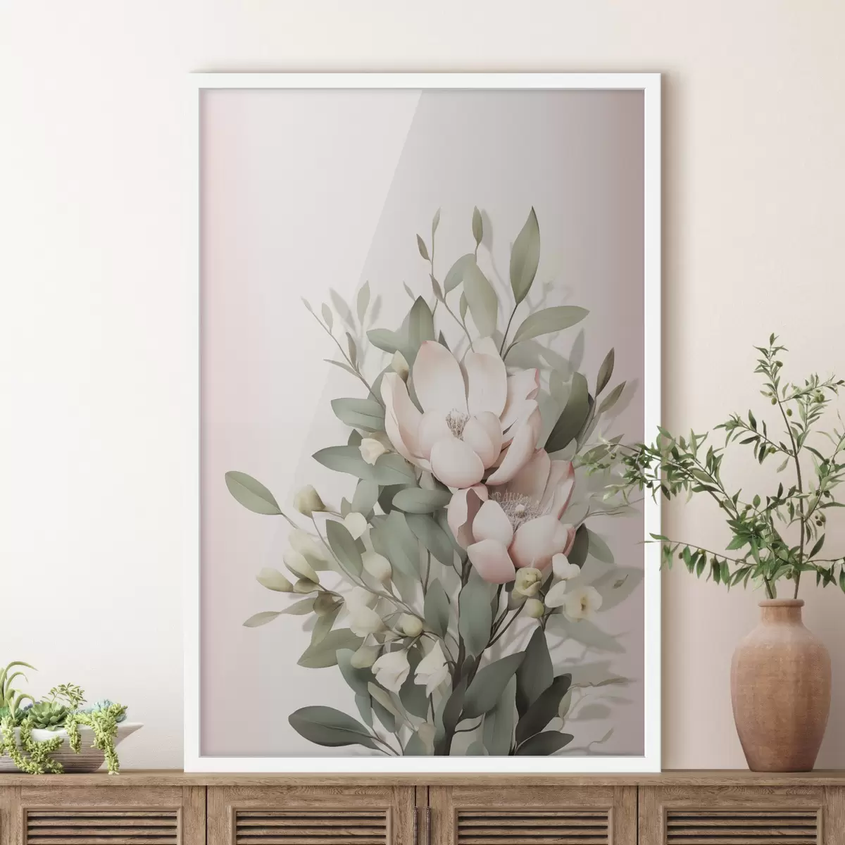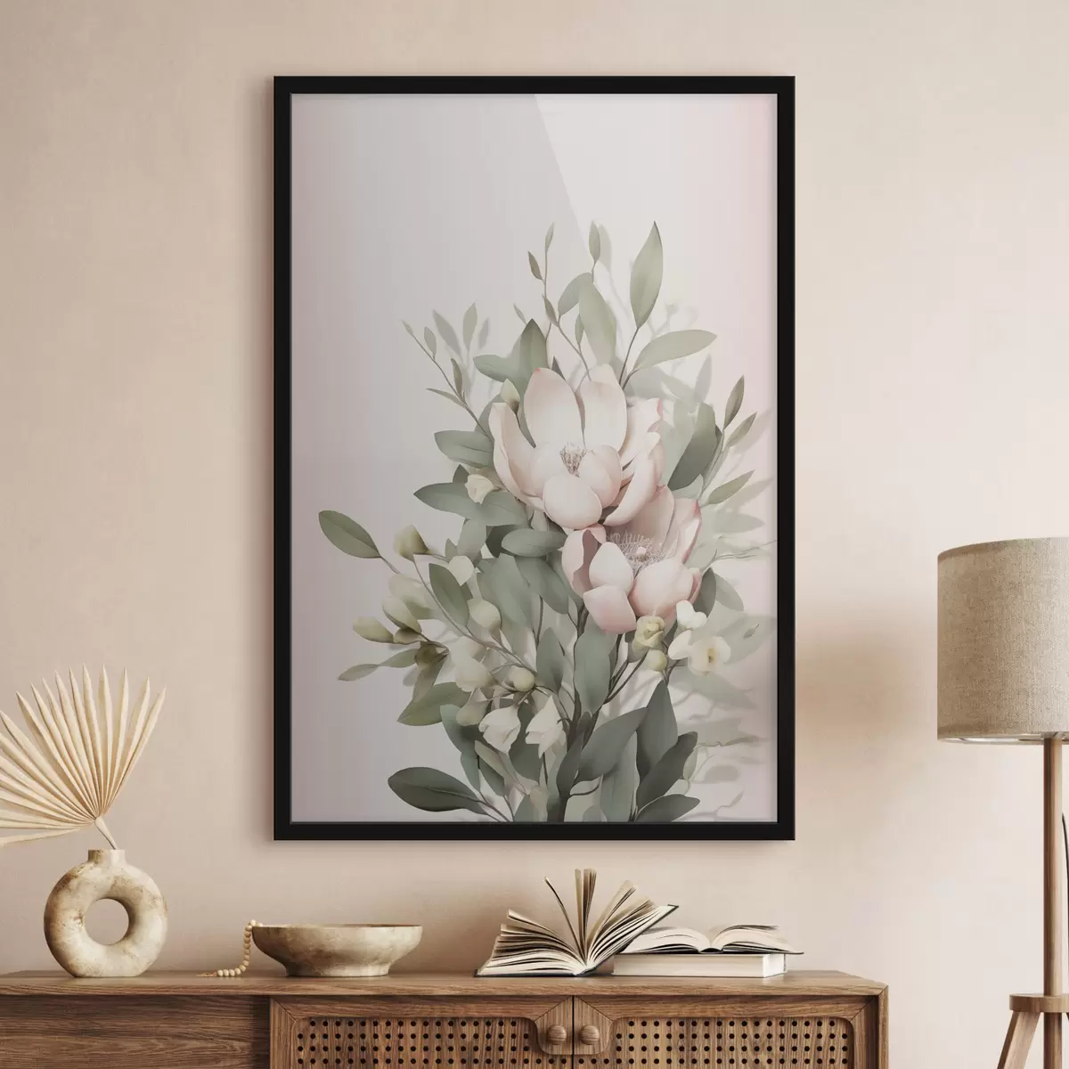 Poster Un bouquet di fiori dai colori pastello con foglie di eucalipto, su uno sfondo rosa pallido Nr f48728