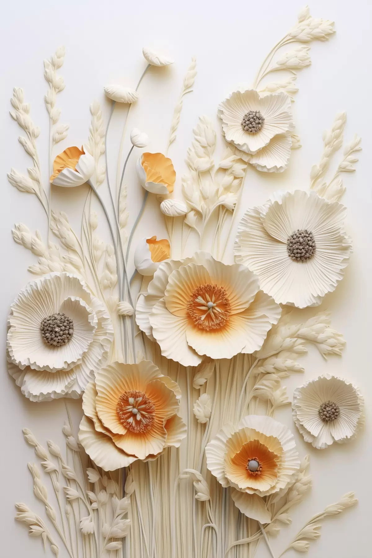Poster Un bouquet di papaveri color crema e arancione con steli di grano essiccato f48747