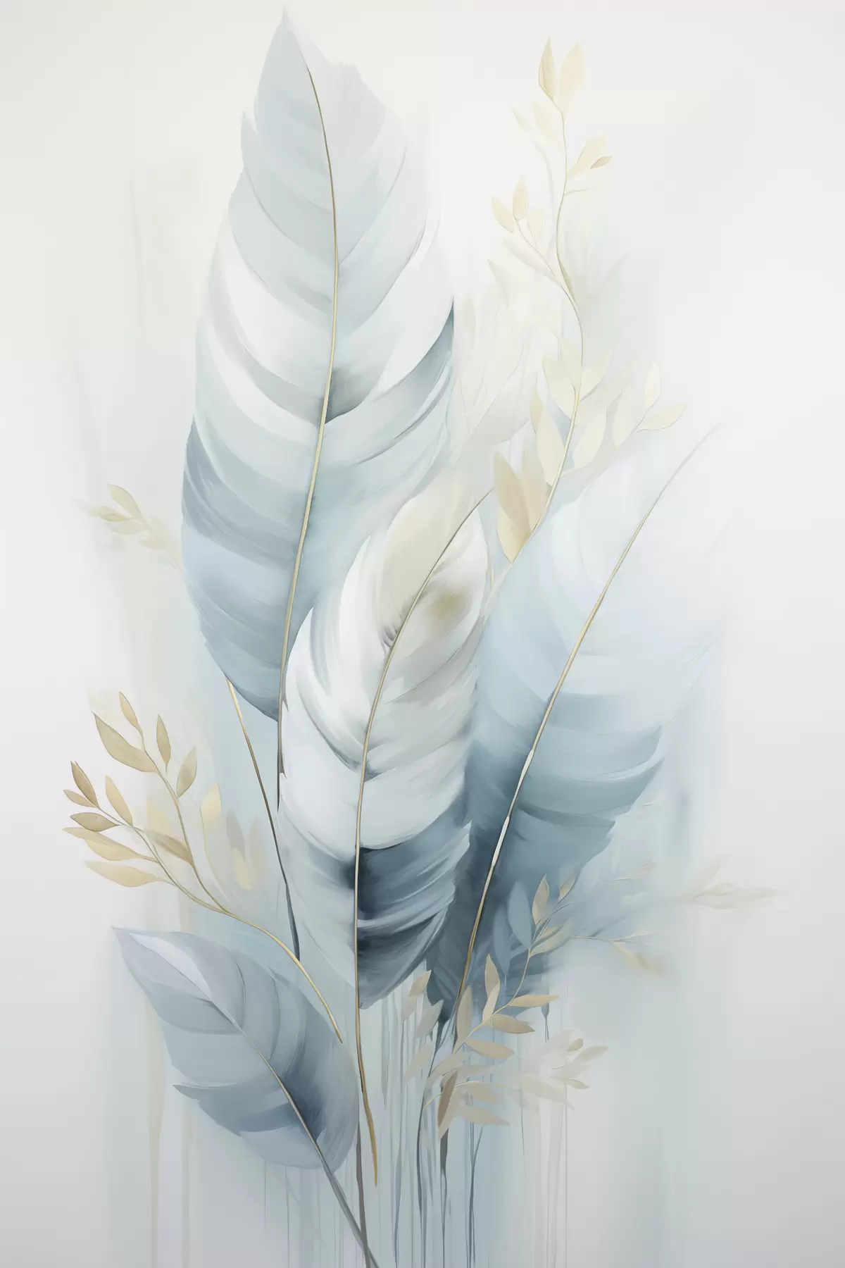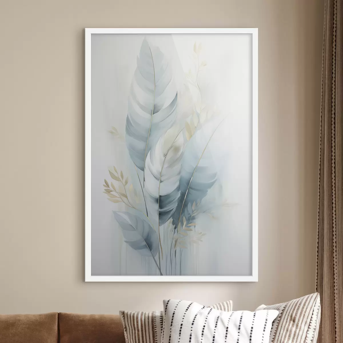 Poster Grandi piume morbide nei toni del blu e del bianco con delicate foglie color beige Nr f48749