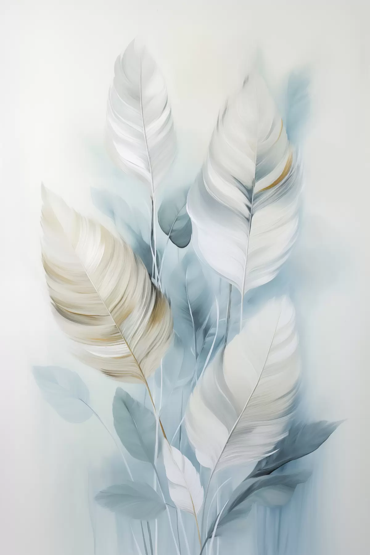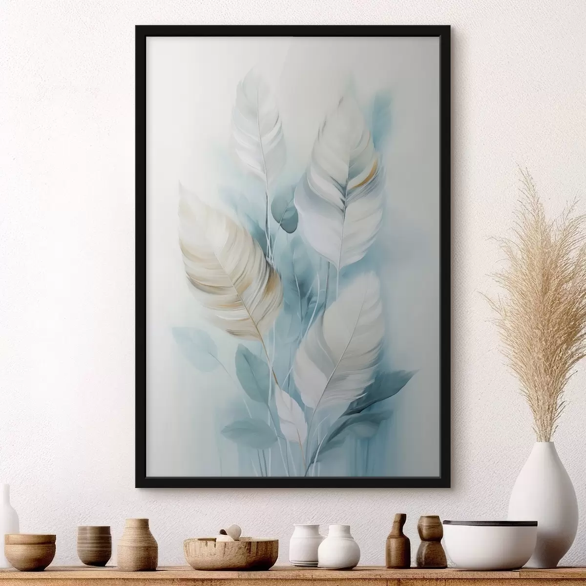 Poster Grandi piume morbide nei toni del blu e del bianco con delicate foglie color beige Nr f48750