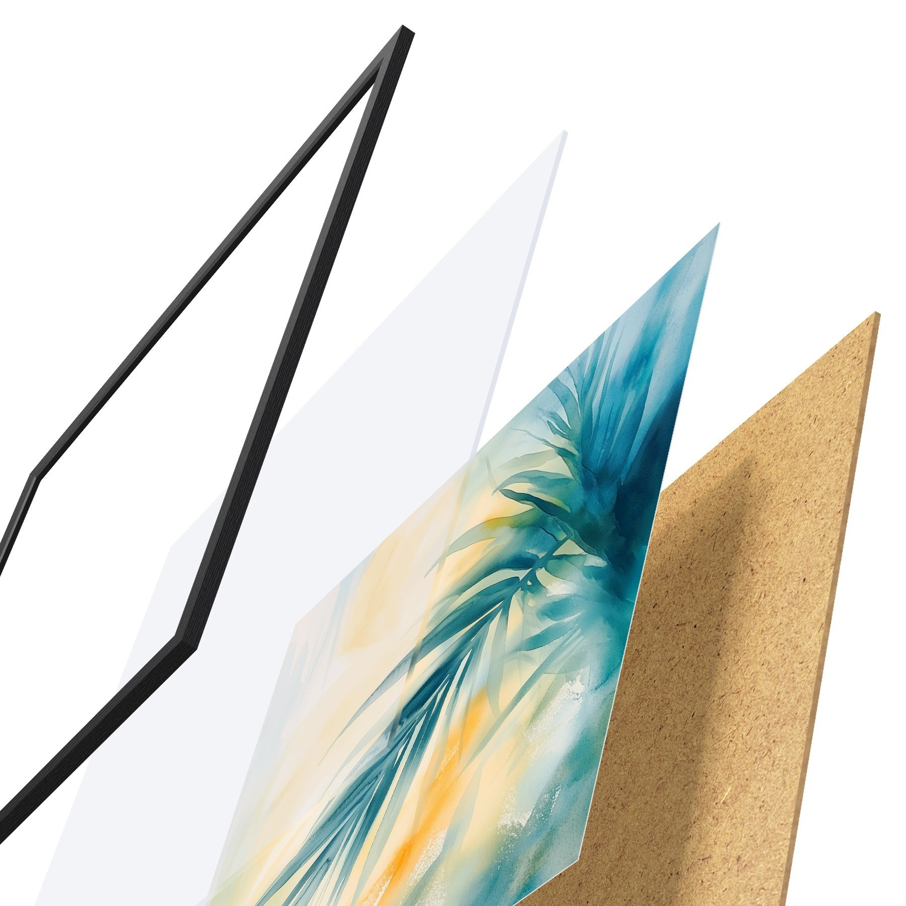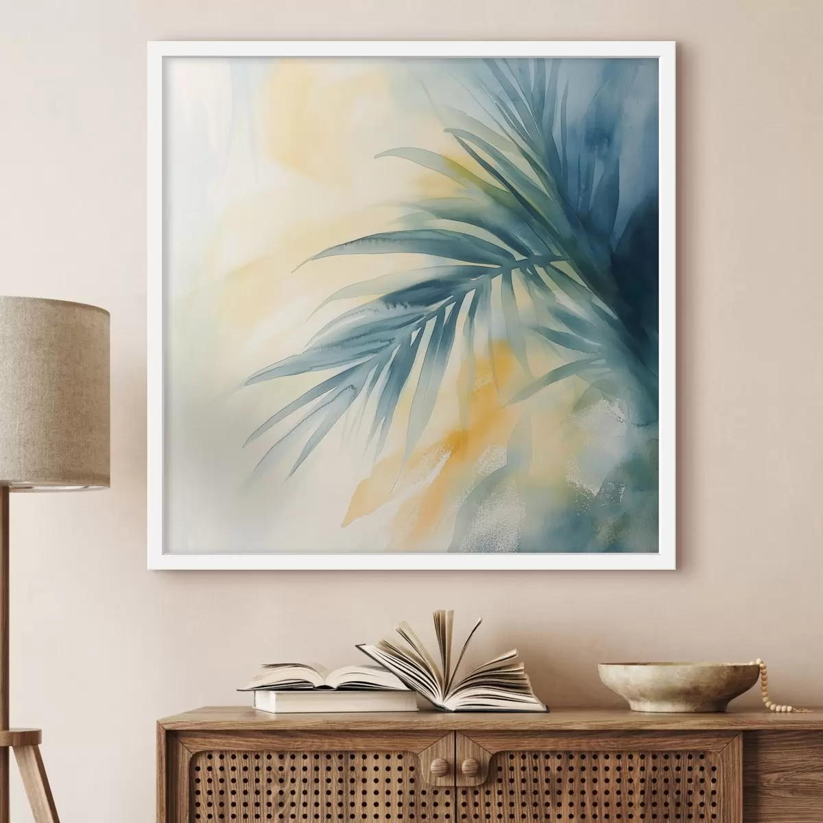 Poster Foglie di palma tropicali in una palette di blu e turchese su uno sfondo di calde macchie acquerellate Nr f48849