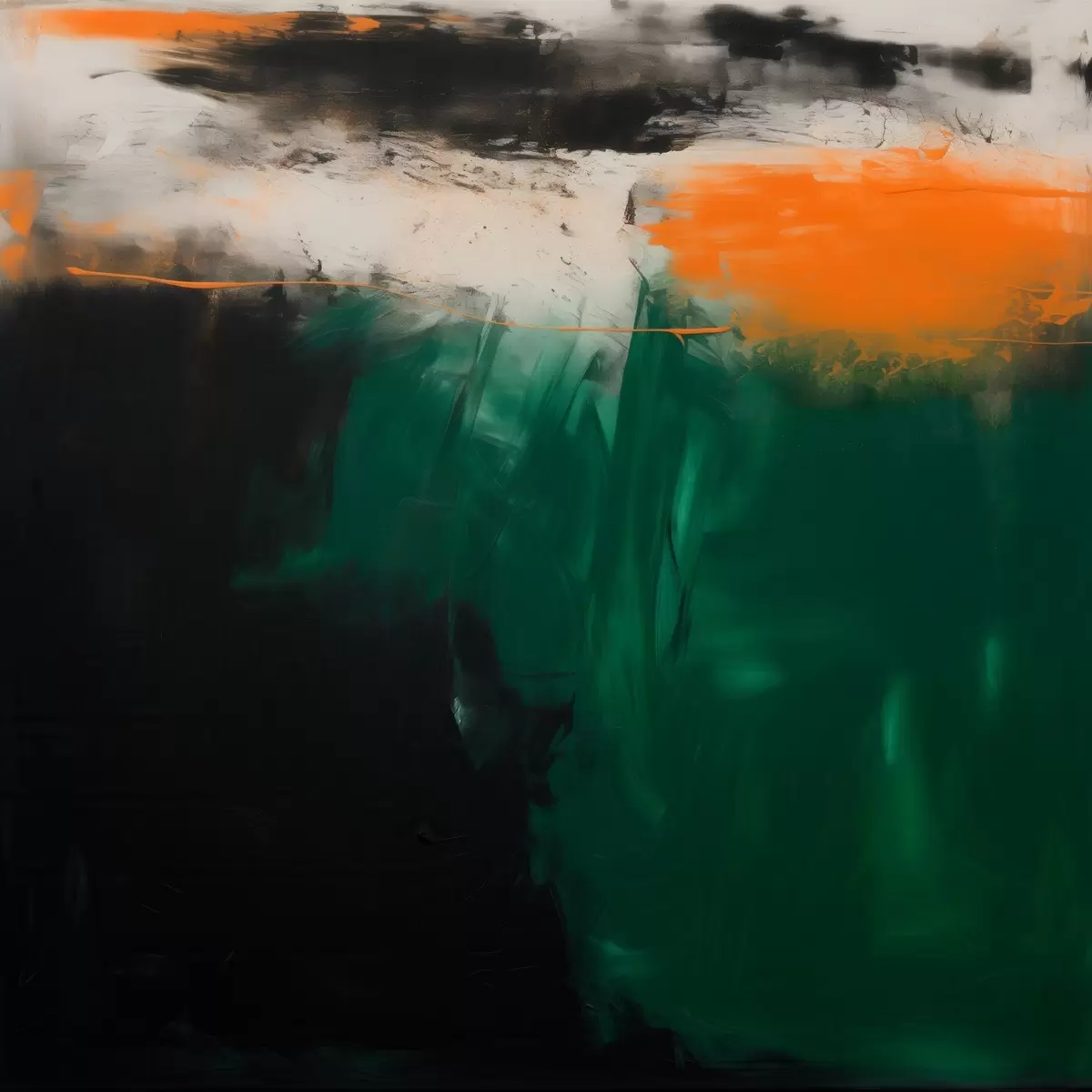 Poster Un'opera astratta caratterizzata da accenti arancioni e pennellate di verde intenso, realizzata in uno stile pittorico contemporaneo f48865