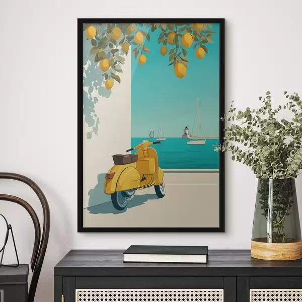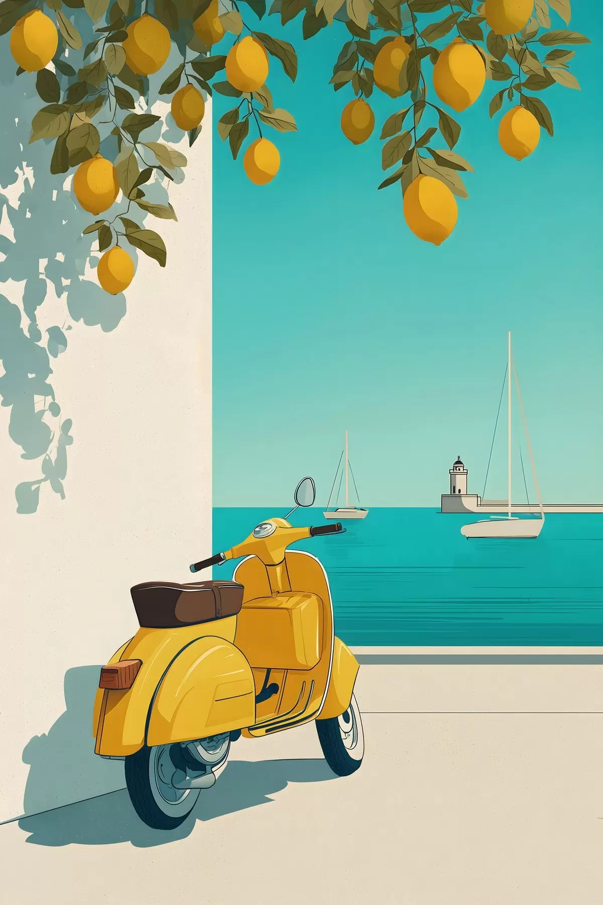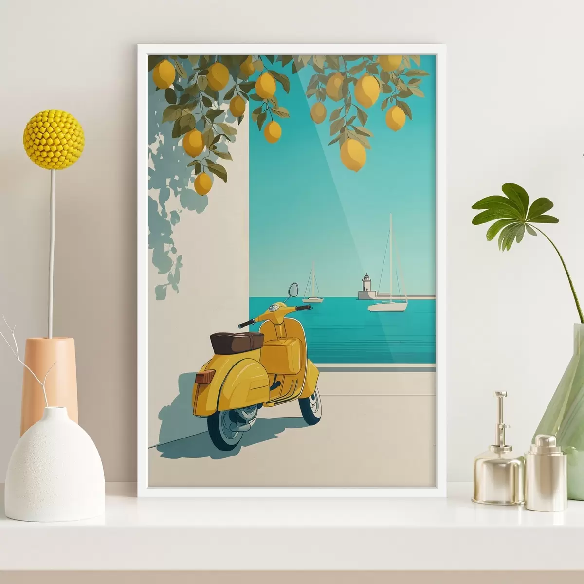 Poster un ciclomotore in riva al mare sotto gli alberi di limone Nr f49008