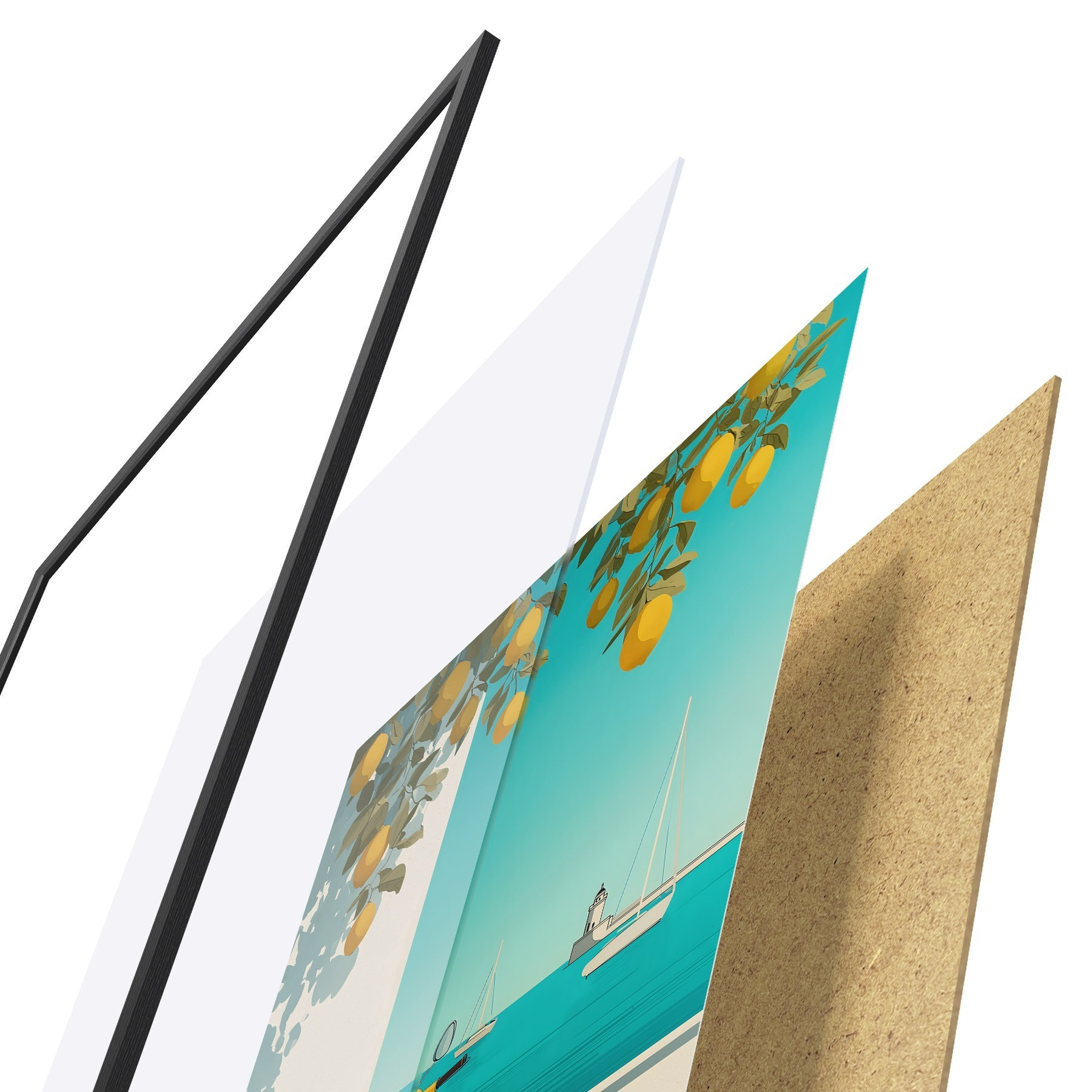 Il poster è composto da cornice, plexiglass, immagine stampata e supporto in truciolato. Il poster può essere immediatamente appeso alla parete grazie ai supporti sul retro.
