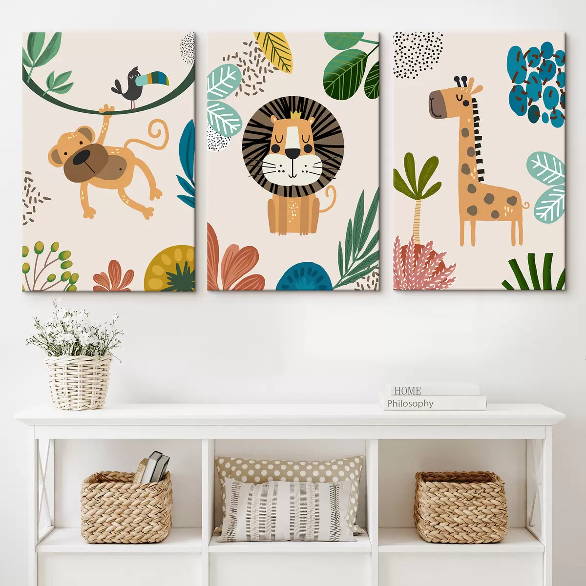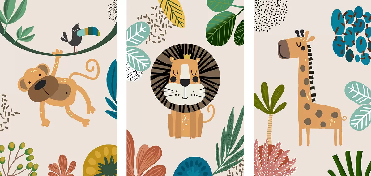 Quadri Animali nella giungla in stile safari, boho: scimmia, leone, giraffa Nr m00332