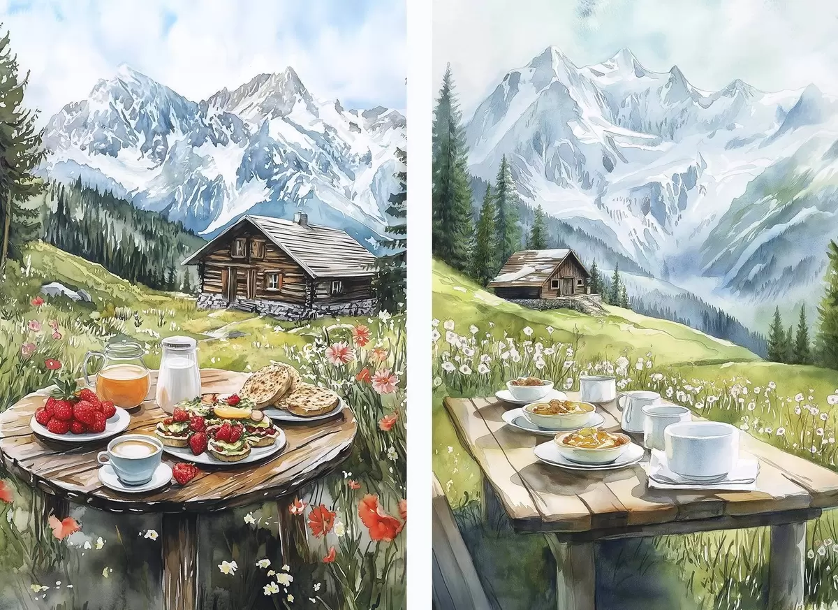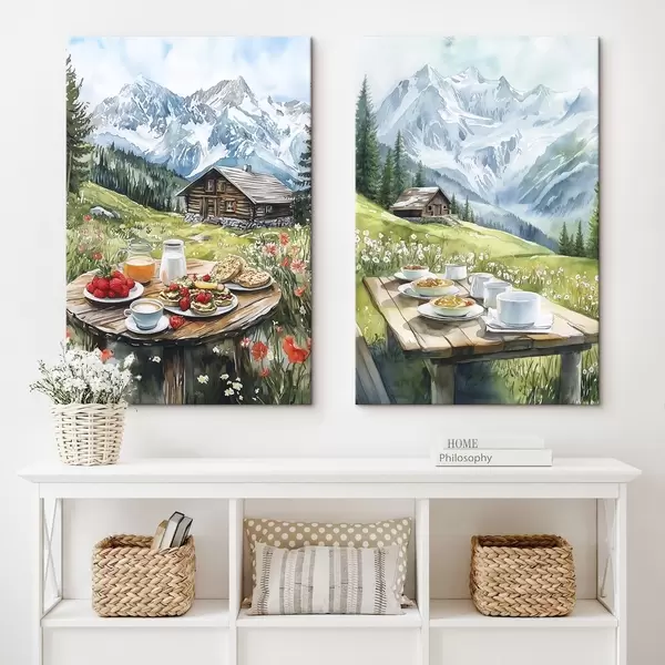 Quadri Le Alpi, un bel paesaggio di montagna, una colazione estetica, case in legno Nr m00403