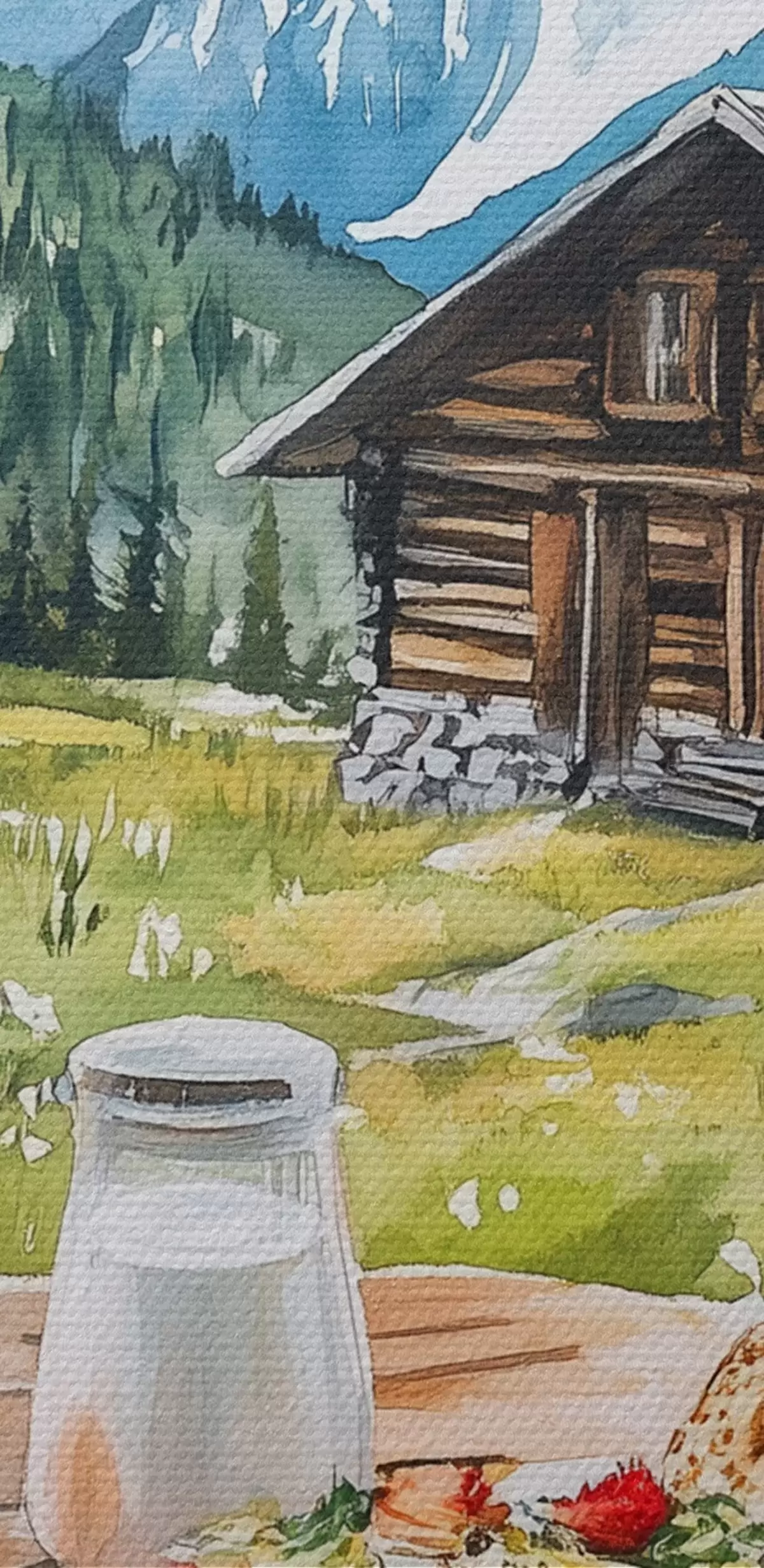 carta da parati Le Alpi, un bel paesaggio di montagna, una colazione estetica, case in legno nr. m00403