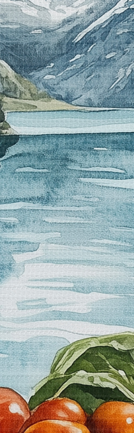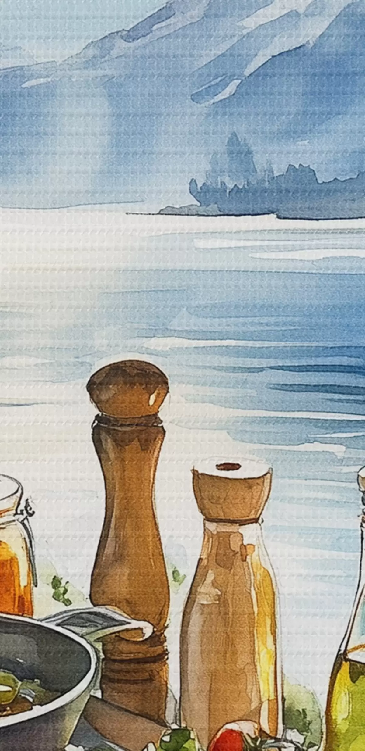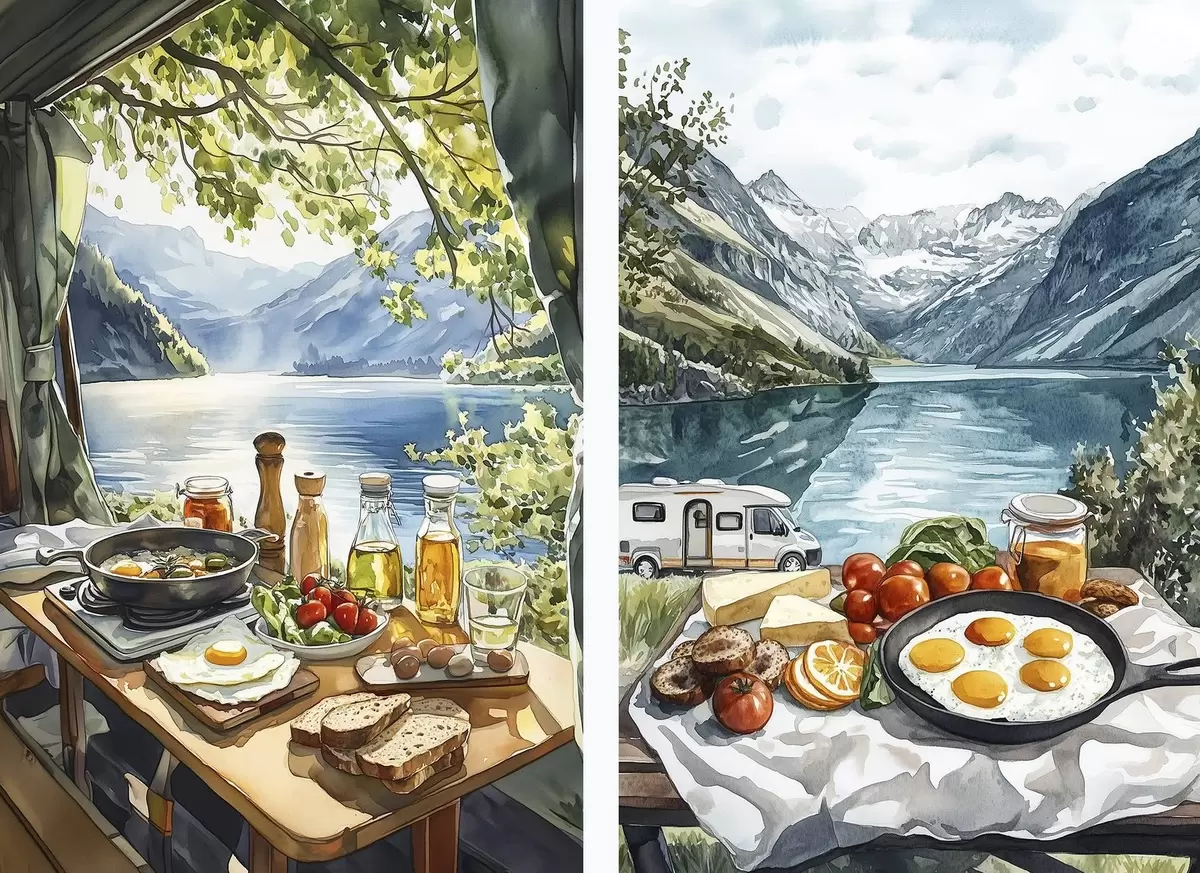 Quadri Campeggio, colazione estetica vicino al lago, stile acquerello Nr m00405