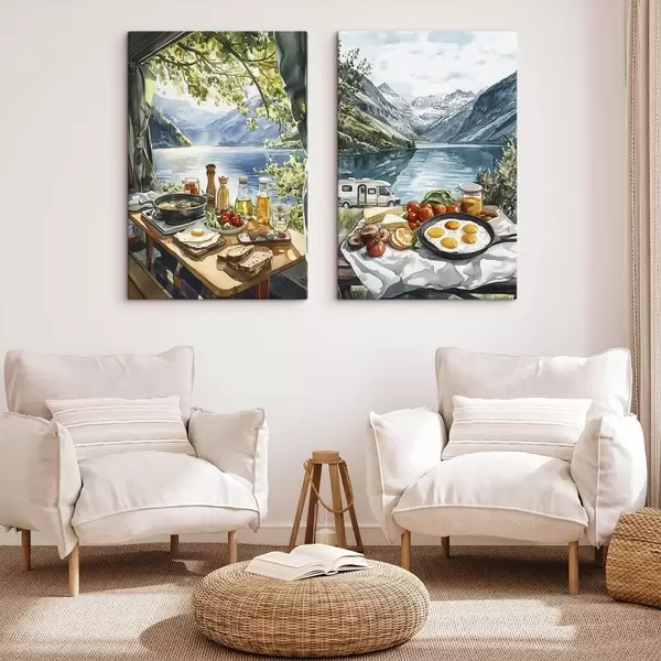 Quadri Campeggio, colazione estetica vicino al lago, stile acquerello Nr m00405
