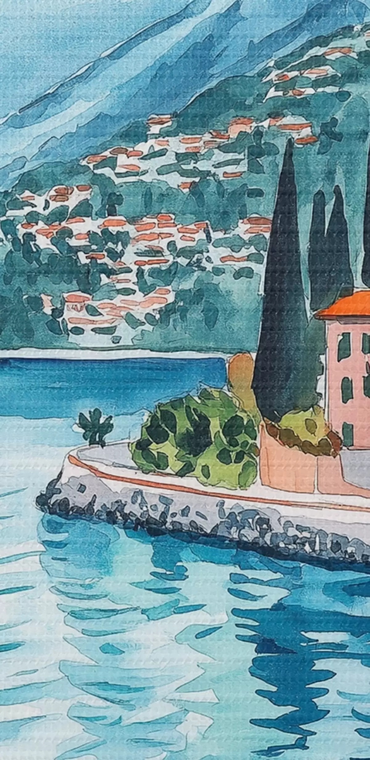 Quadri Lago di Como, brunch in Italia, stile acquarello, pizza margarita, natura estiva Nr m00406