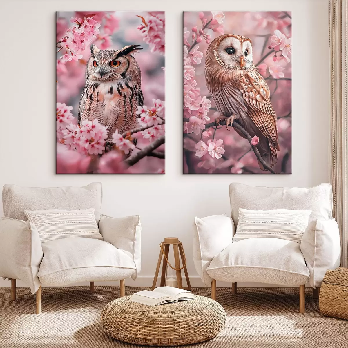 Quadri Gufi sul ciliegio, fiori rosa, realismo, natura Nr m00411