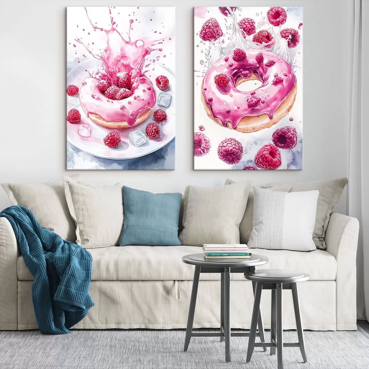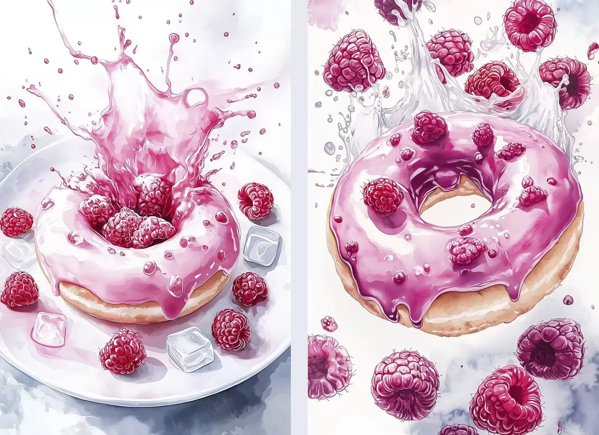 Quadri Deliziose ciambelle in stile acquerello con lamponi, colori rosa Nr m00412