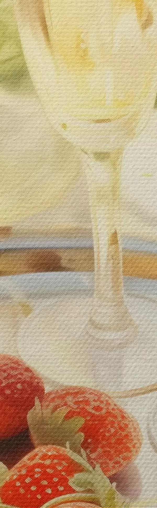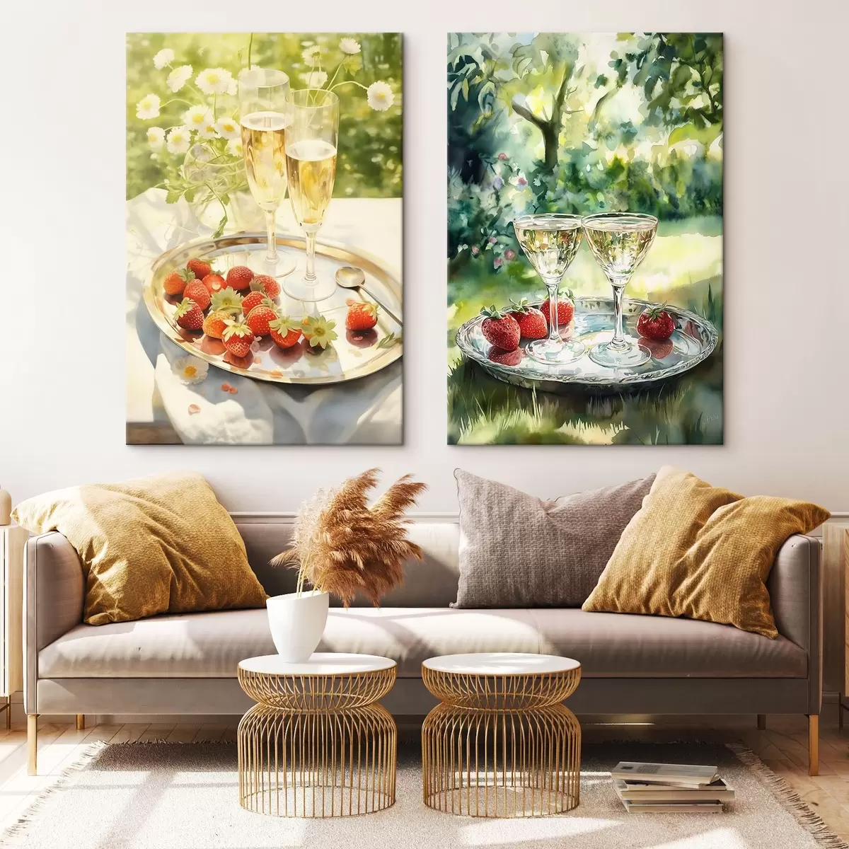 Quadri Picnic estivo, bicchieri di champagne con fragole sul vassoio, fiori di camomilla Nr m00414