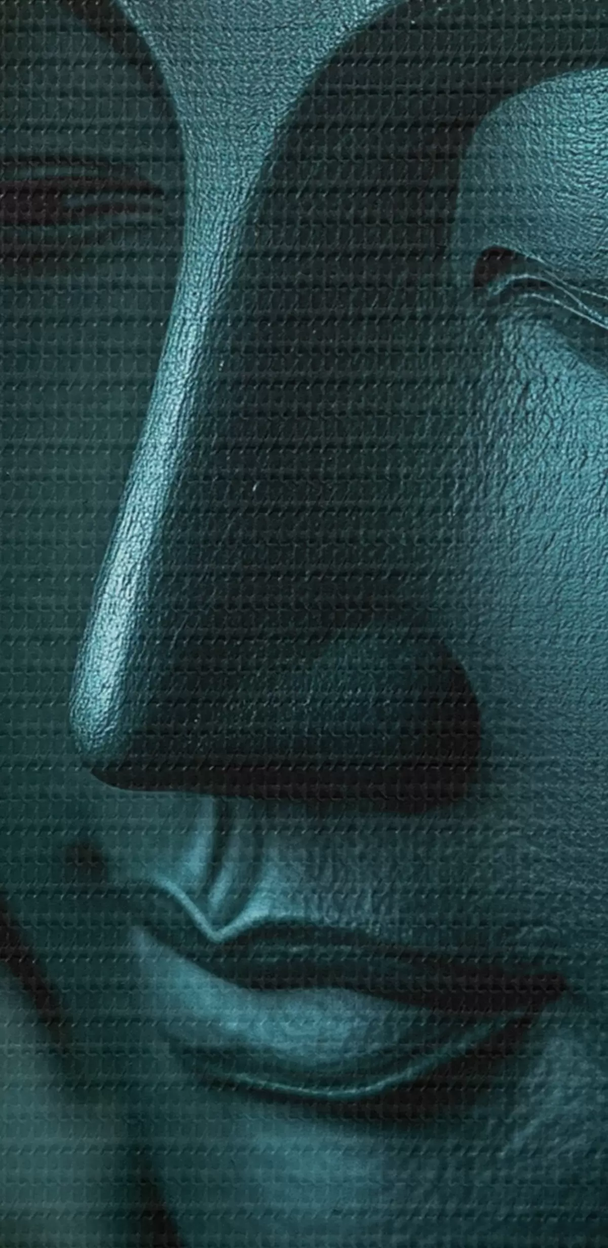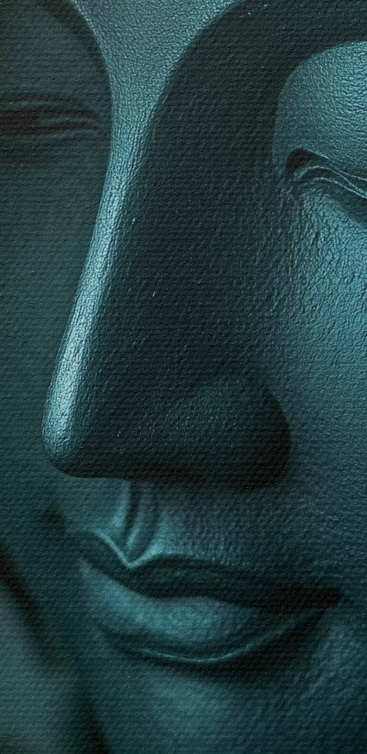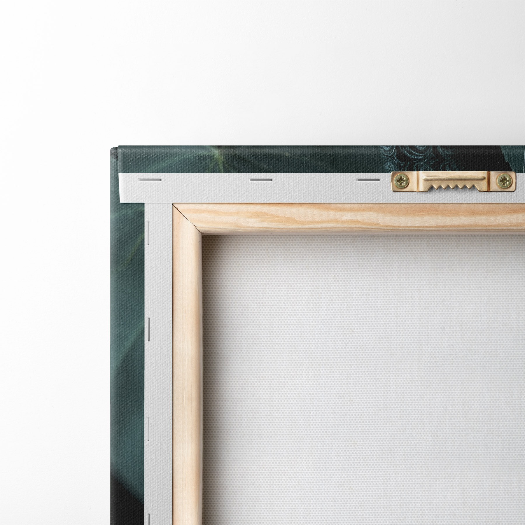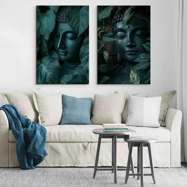 Quadri Buddha meditativo tra le foglie verdi, buddismo, tropicale, realismo Nr m00447