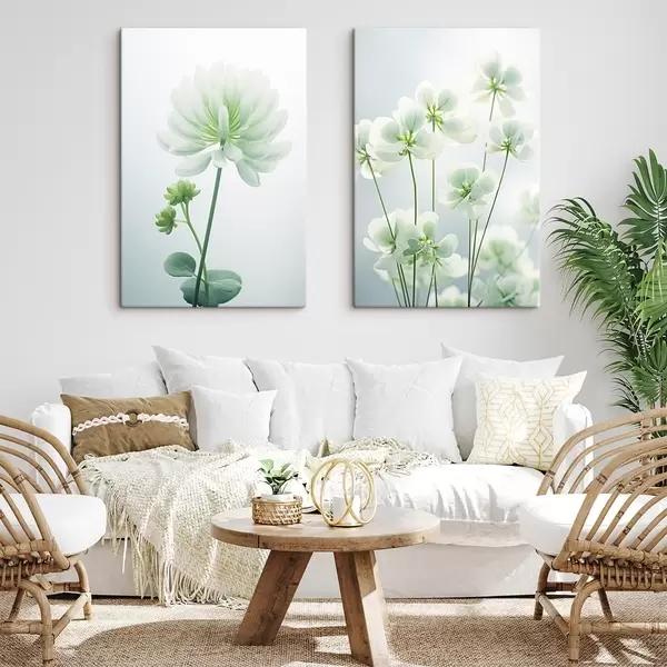 Quadri Fiori di trifoglio bianco con stelo e foglie verdi, luce soffusa, sfondo pulito, composizione minimalista, botanica Nr m00520