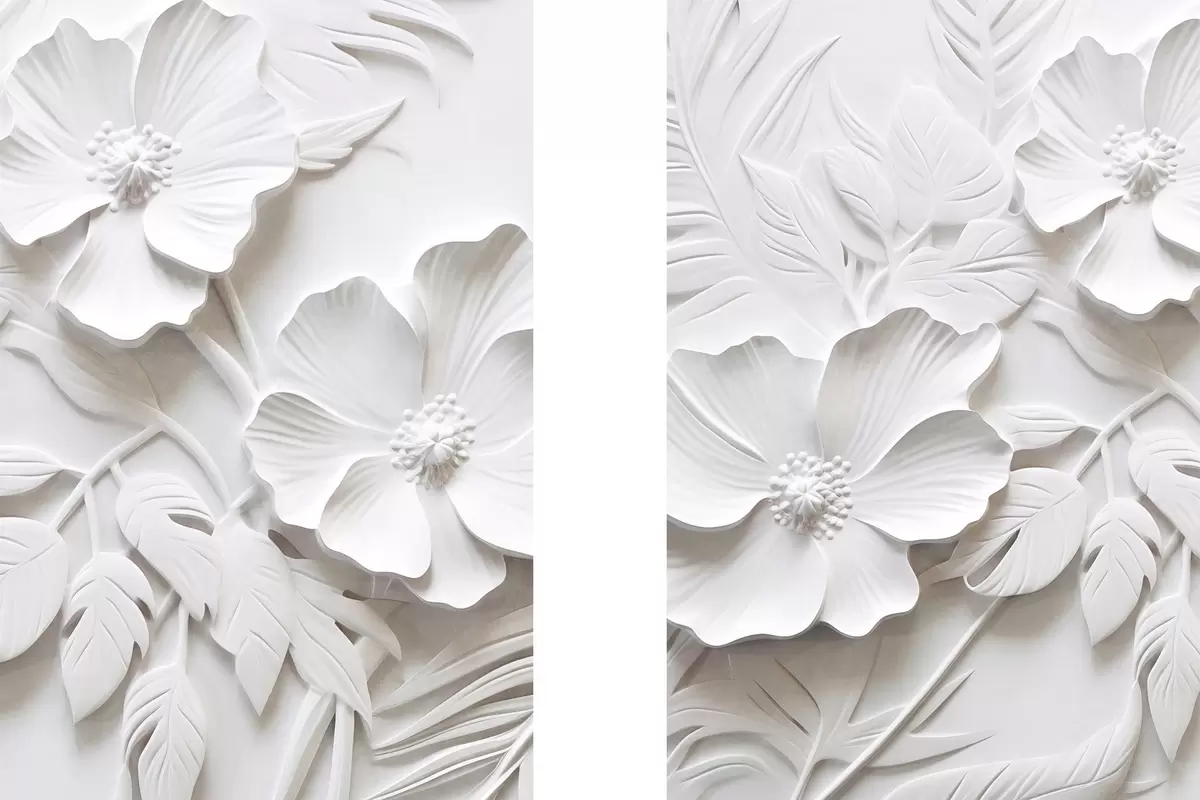 Quadri Fiori bianchi minimalisti decorativi con foglie, imitazione in rilievo, sfondo bianco Nr m00524