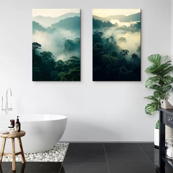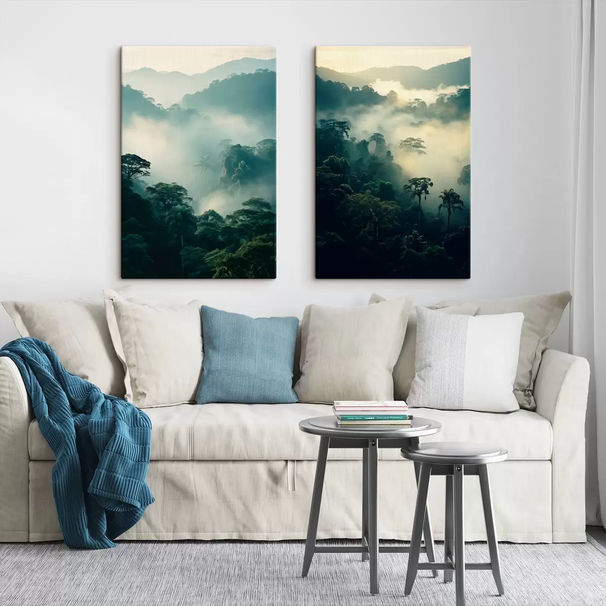 Quadri Foresta pluviale tropicale con alberi verdi e uno spesso strato di nebbia che crea un ambiente suggestivo Nr m00529
