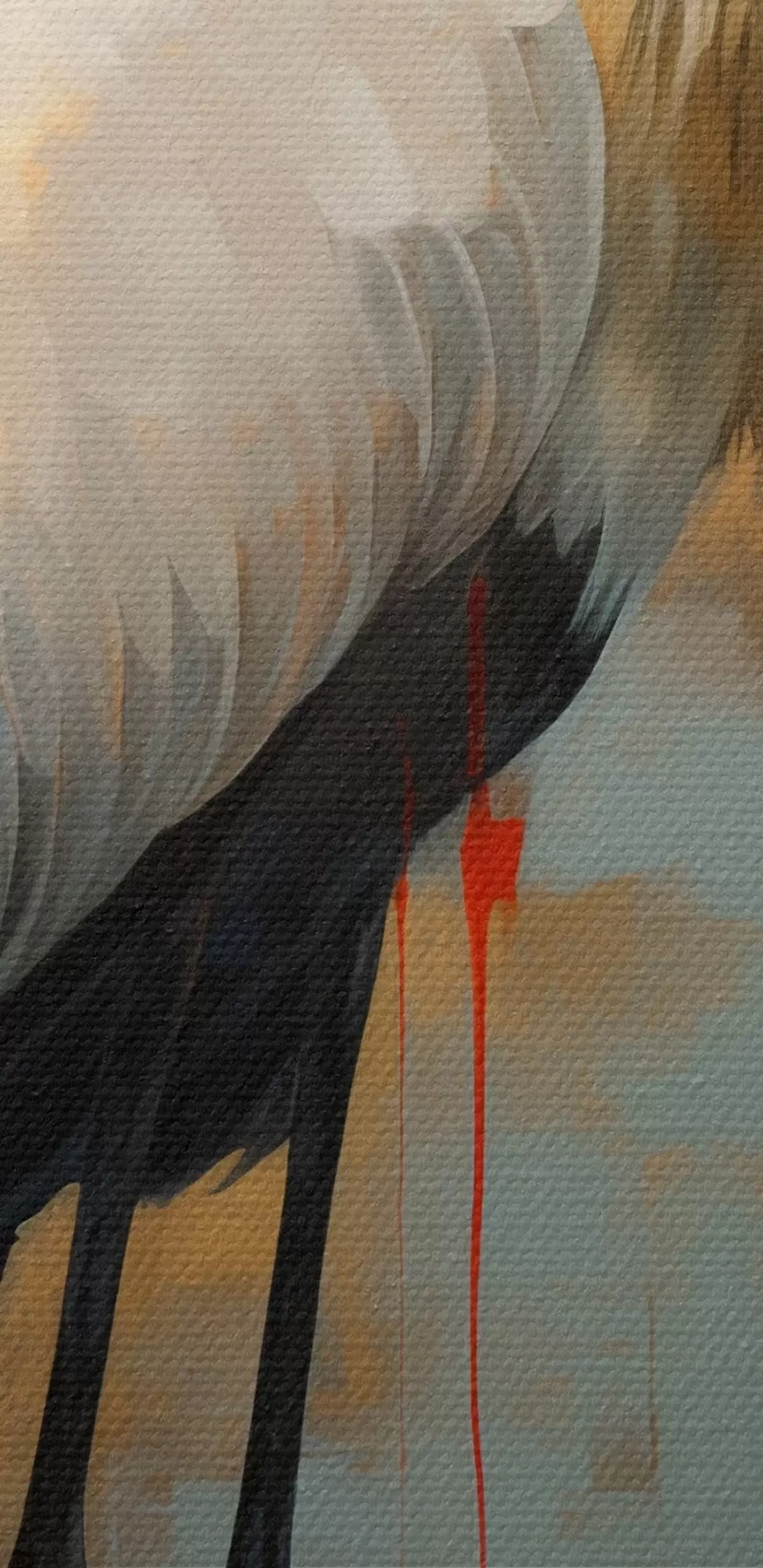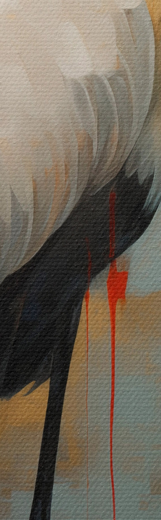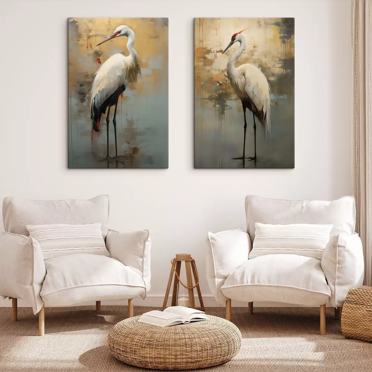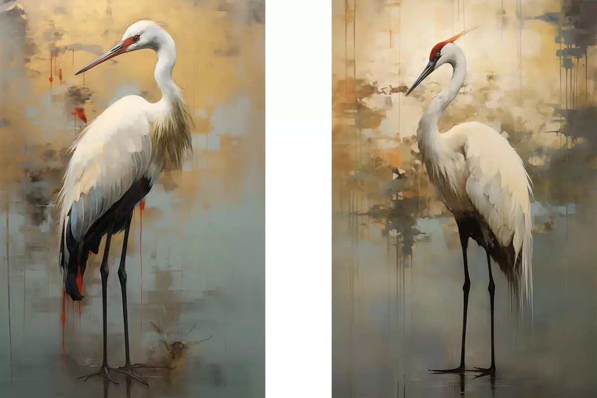 Quadri Airone bianco su uno sfondo di sfumature gialle, marroni e blu che suggeriscono un paesaggio nebbioso e astratto Nr m00530