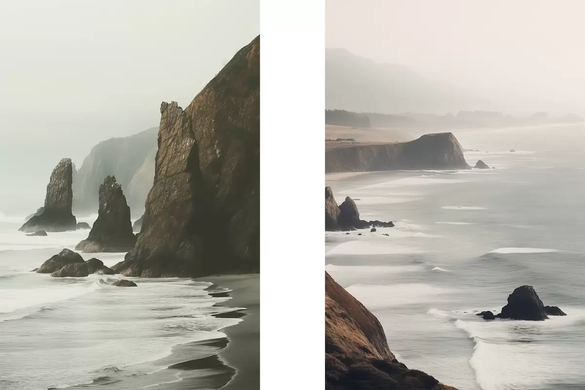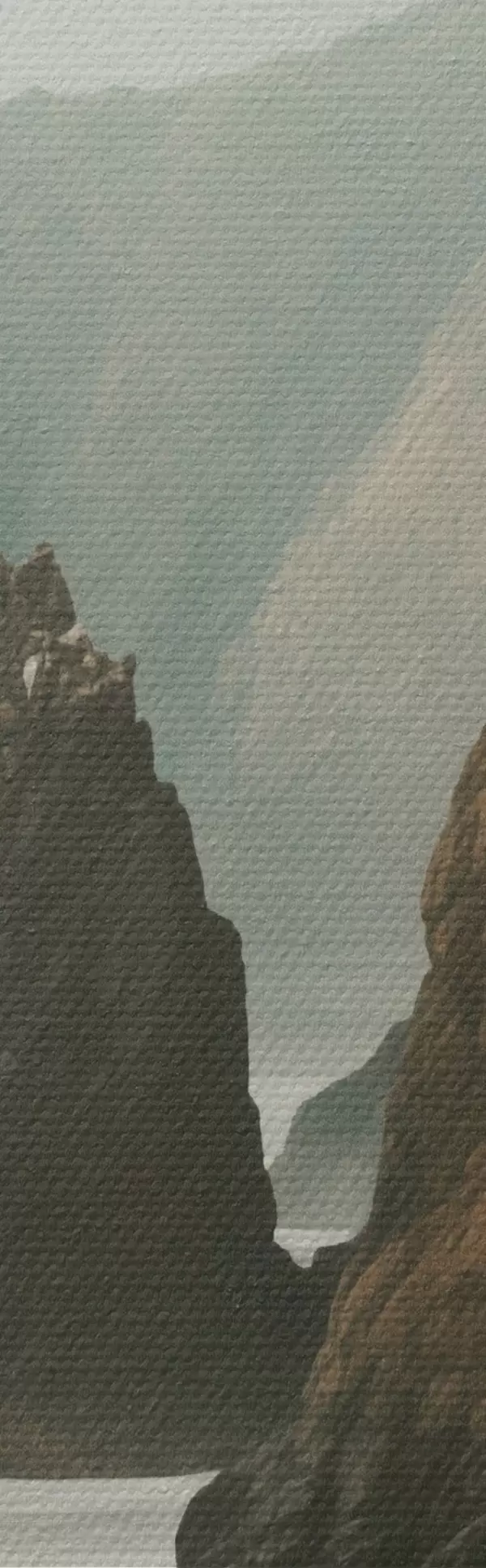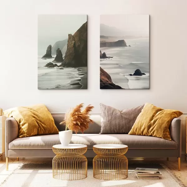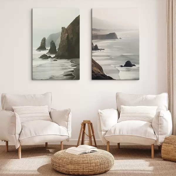 Quadri Scogliere rocciose e costa marina, onde che si infrangono sulla riva, paesaggio dall'atmosfera lunatica, toni terrosi Nr m00531