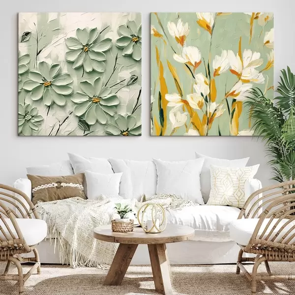 Quadri Prato fiorito: composizione artistica con fiori volumetrici su sfondo pastello Nr m00567