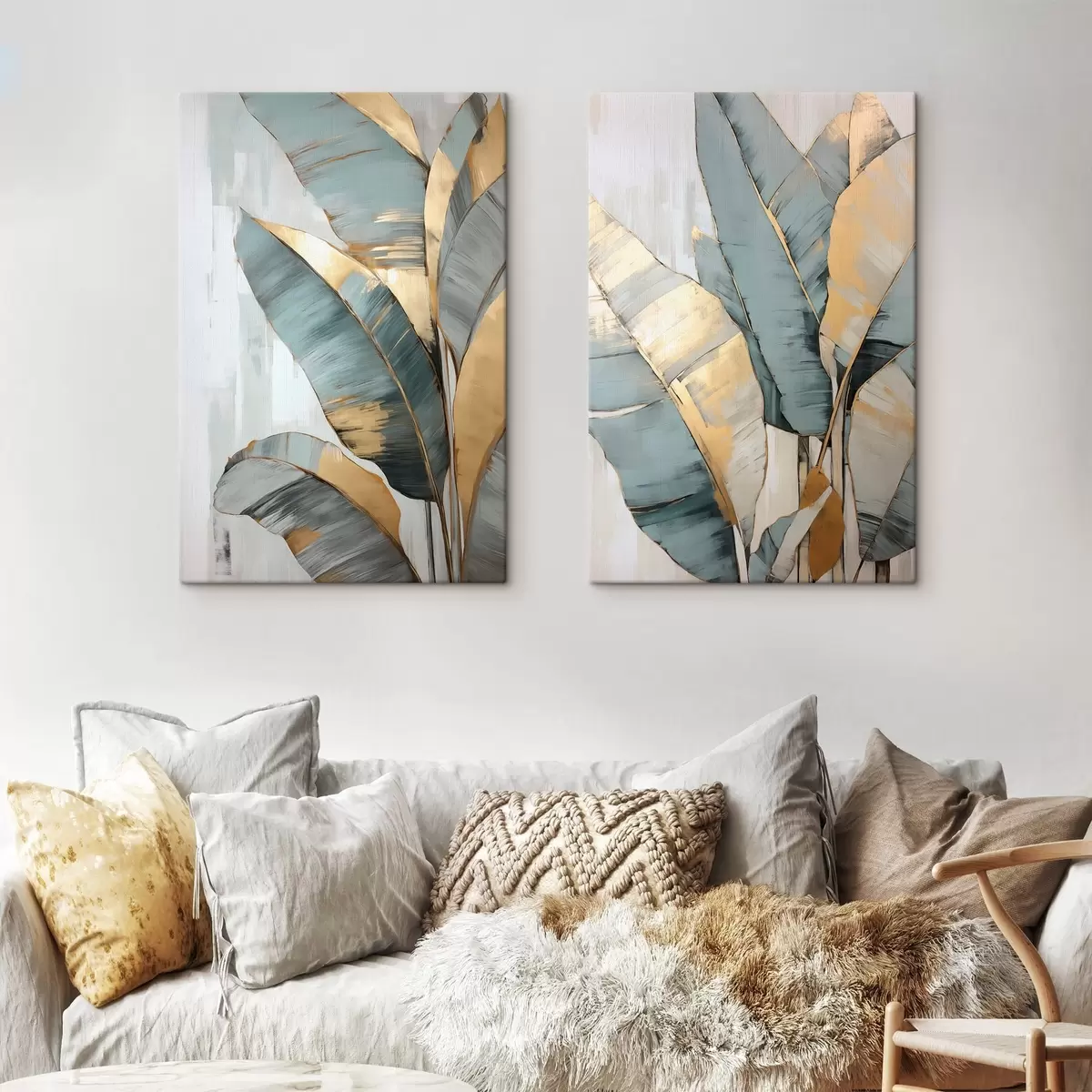 Quadri Un insieme di foglie di banano blu, grigie e gialle con pennellate visibili, su uno sfondo bianco astratto Nr m00645