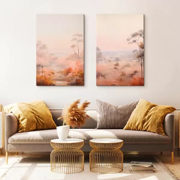 carta da parati Un paesaggio con cespugli e alberi nei toni del rosa, dell'arancio e del marrone, con le montagne sullo sfondo nr. m00646