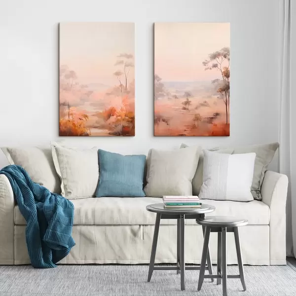 Quadri Un paesaggio con cespugli e alberi nei toni del rosa, dell'arancio e del marrone, con le montagne sullo sfondo Nr m00646