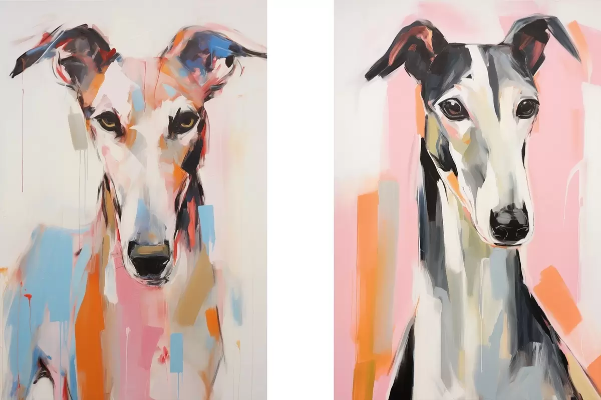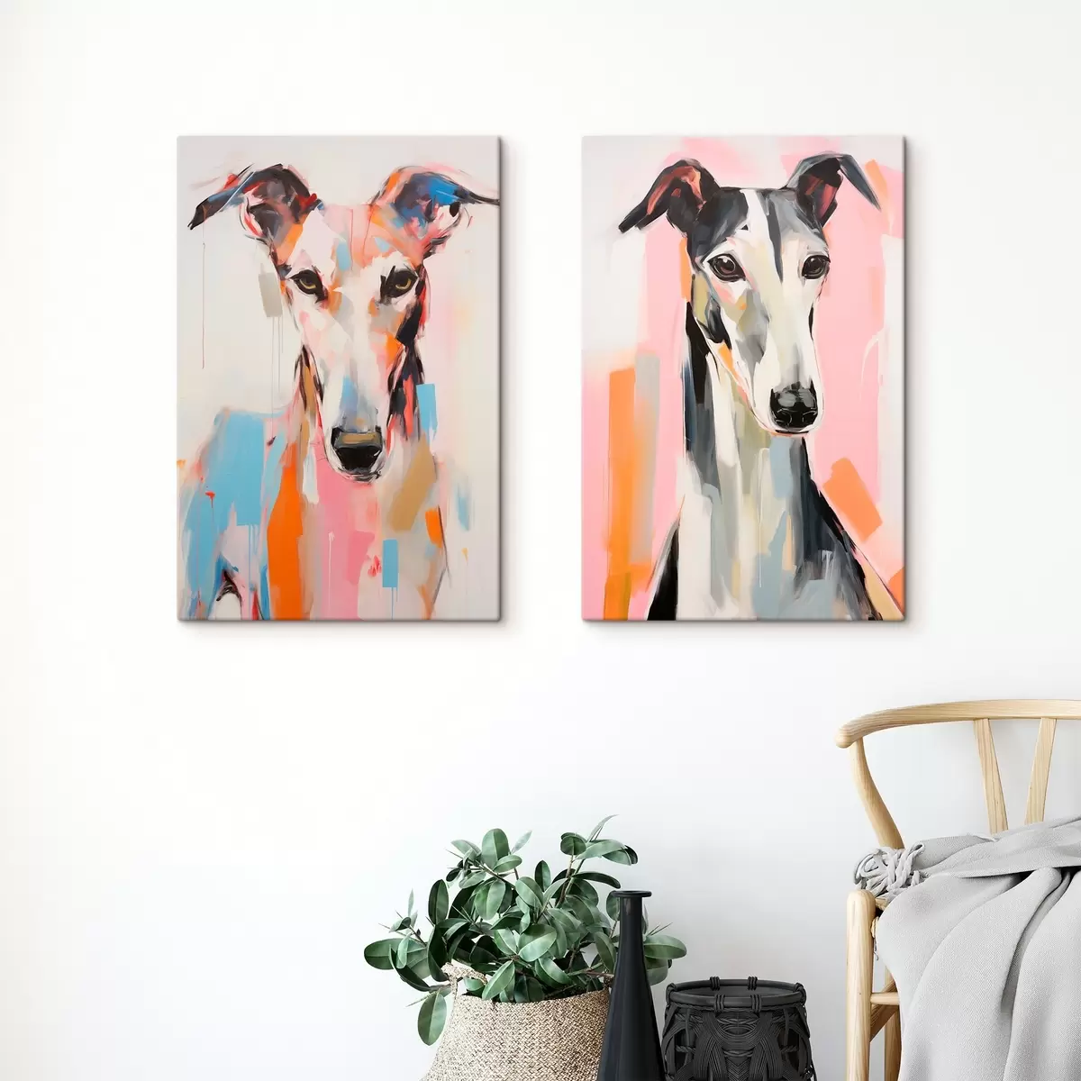 Quadri Un cane levriero, dipinto con colori vivaci come l'arancione, il rosa e il blu, su uno sfondo bianco Nr m00652