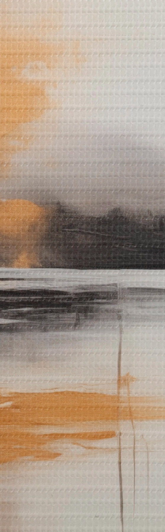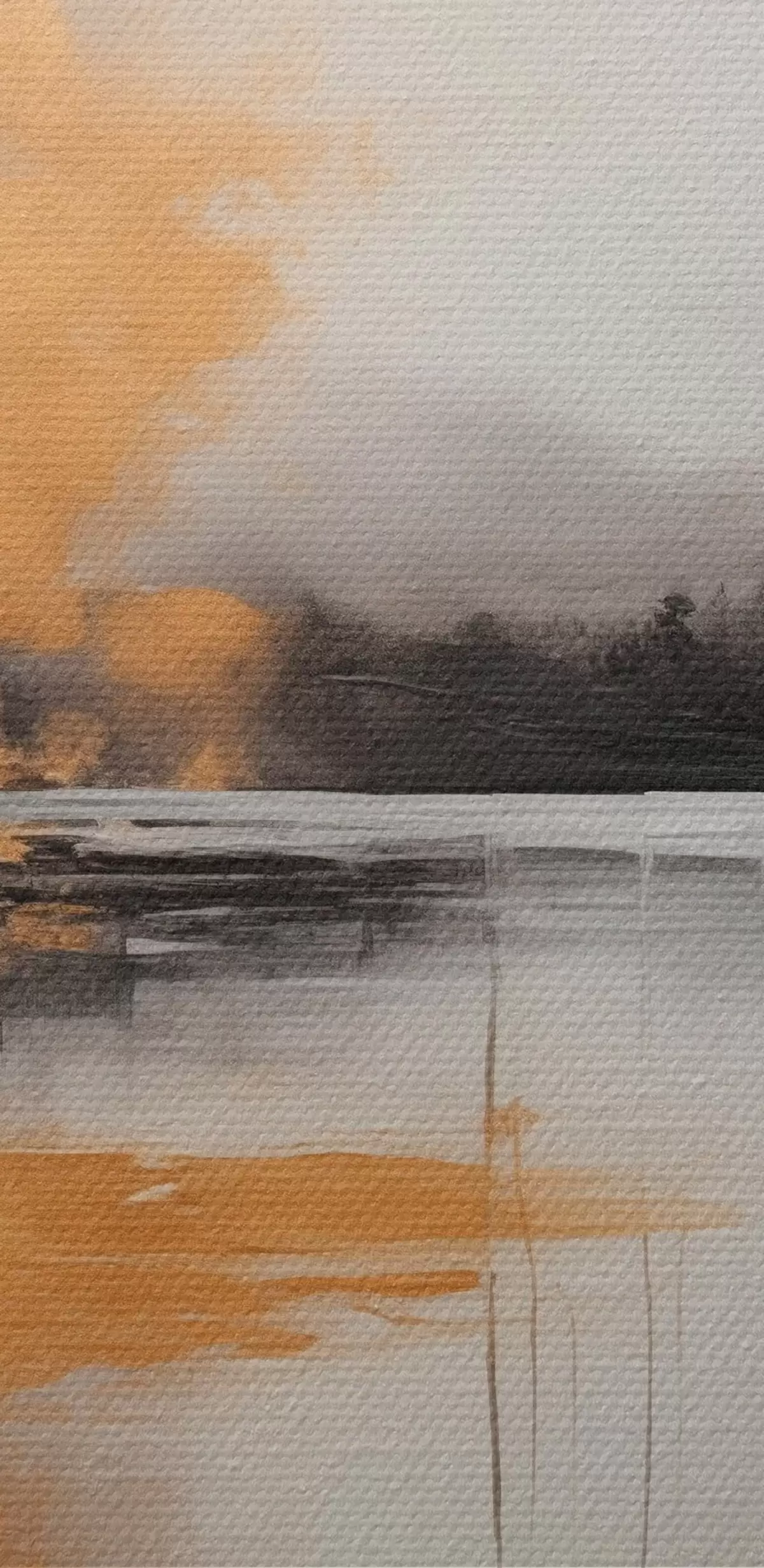 Quadri Un paesaggio astratto con un lago, un albero e la nebbia gialla, l'acqua riflette e il cielo nuvoloso Nr m00657
