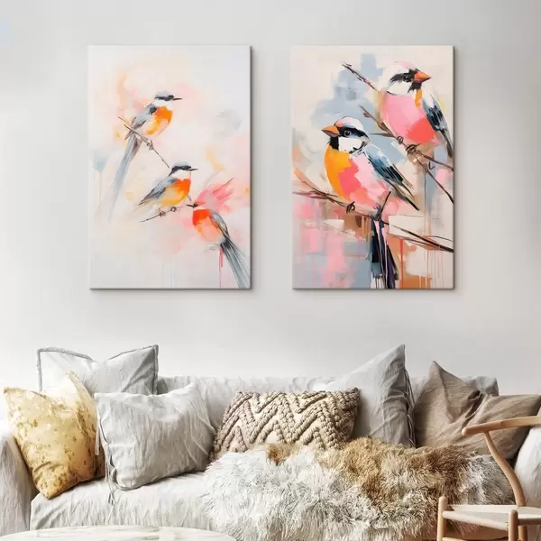 Quadri Uccelli appollaiati sui rami, colori pastello tenui, sfondo chiaro con sfumature rosa e bianche Nr m00658