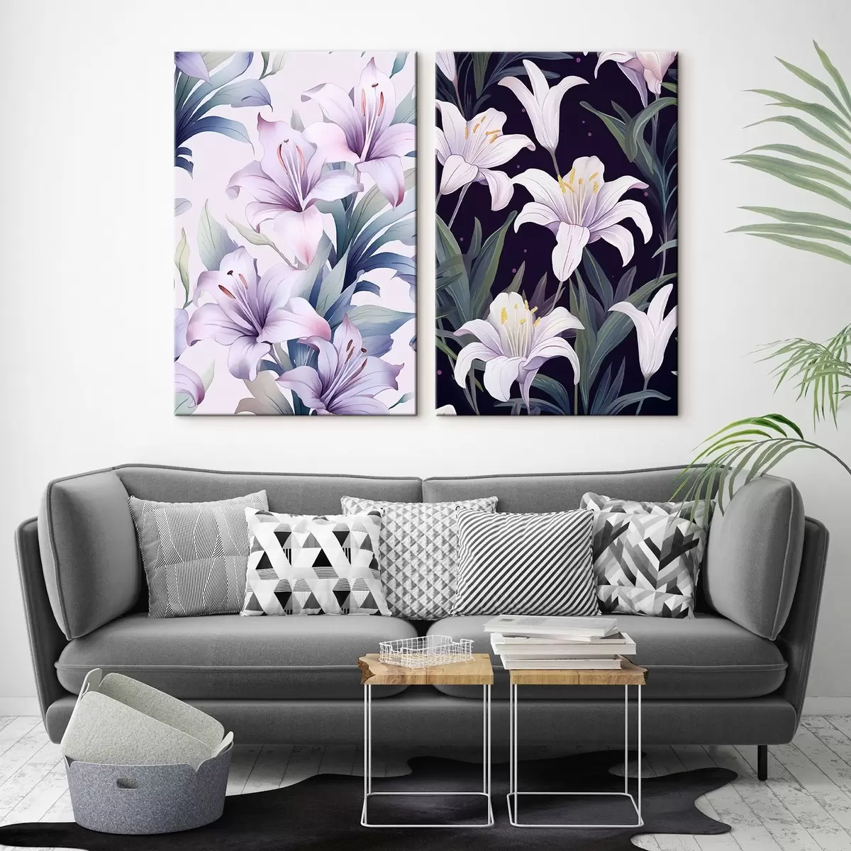 Quadri Delicati gigli rosa con foglie verdi su sfondo chiaro e scuro Nr m00689