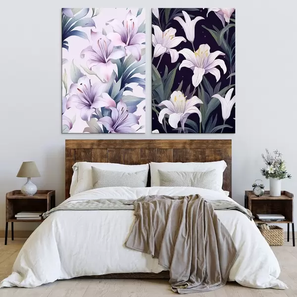 Quadri Delicati gigli rosa con foglie verdi su sfondo chiaro e scuro Nr m00689