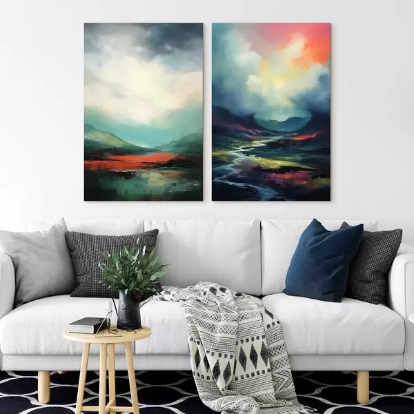 Quadri Paesaggio astratto con nuvole nei toni del turchese e del rosso Nr m00691