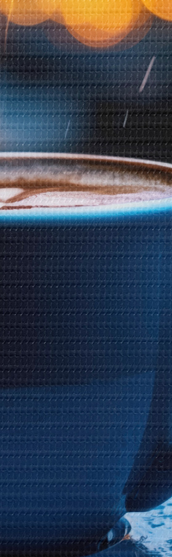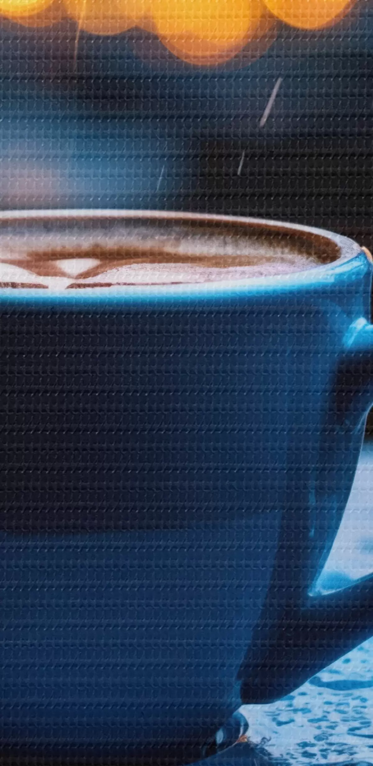 carta da parati Fiori blu con gocce d'acqua e una tazza di caffè sotto la pioggia nr. m00694