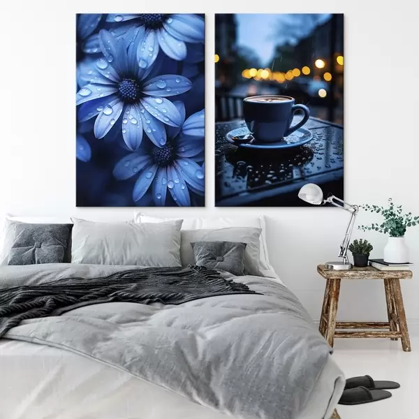 Quadri Fiori blu con gocce d'acqua e una tazza di caffè sotto la pioggia Nr m00694