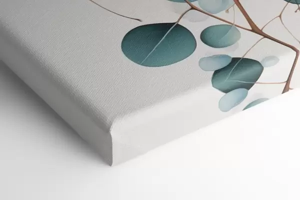Quadri Ramo di eucalipto con foglie blu e fiori bianchi, sfondo chiaro Nr m00829