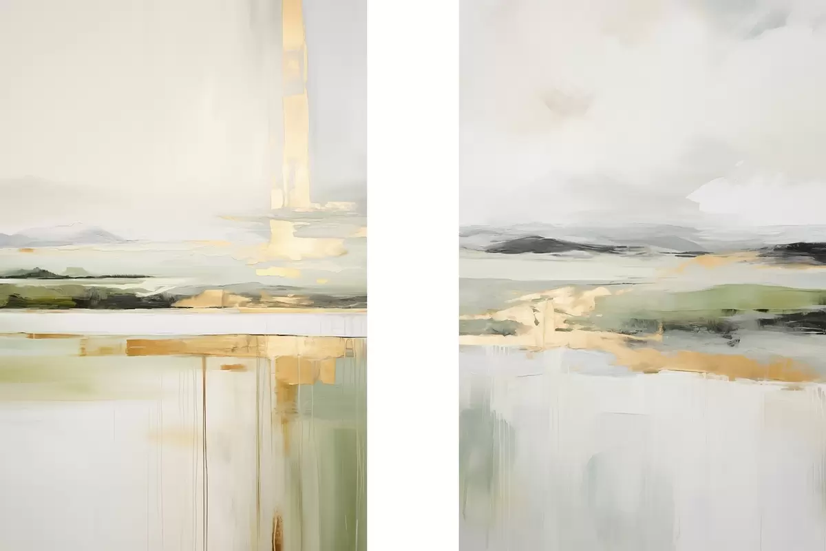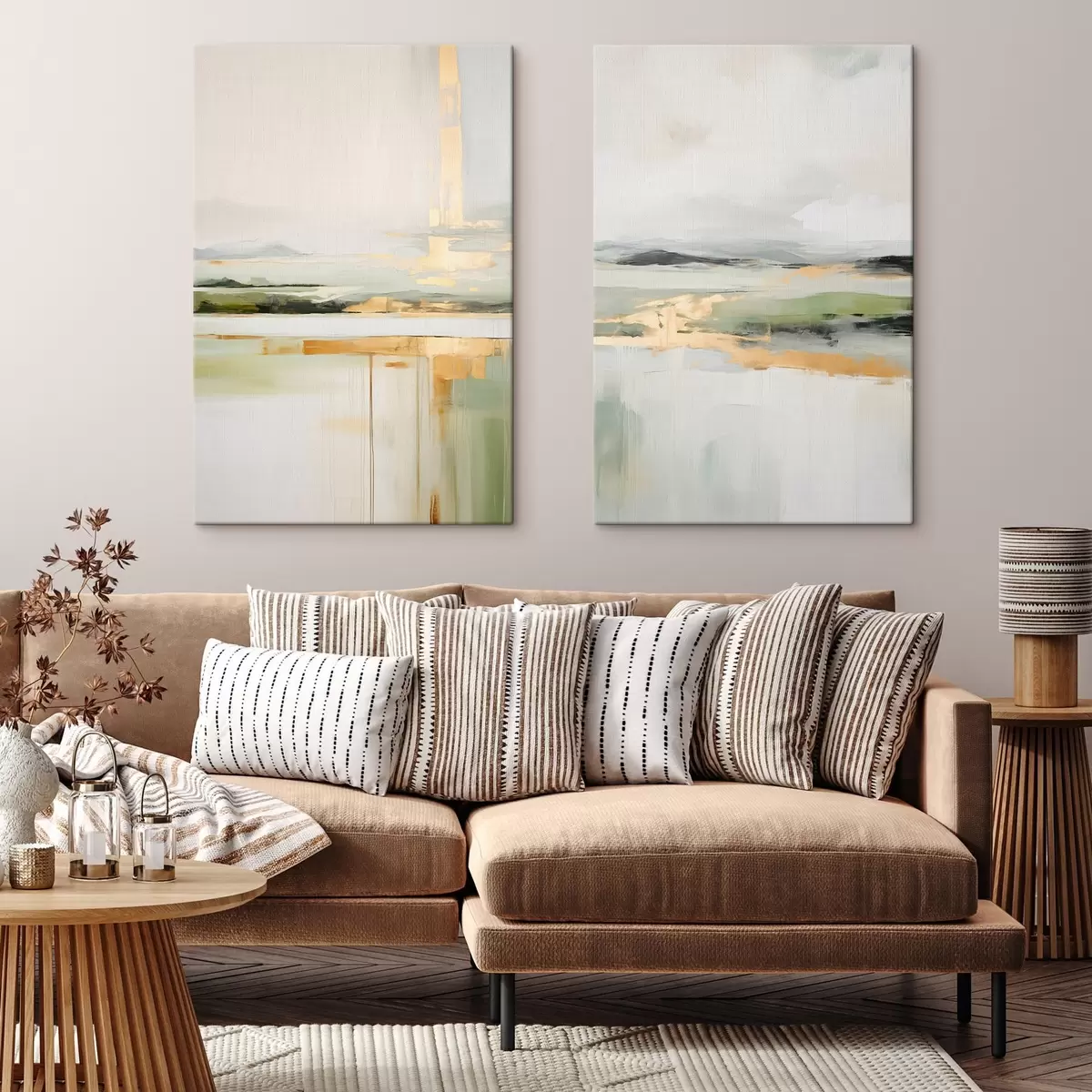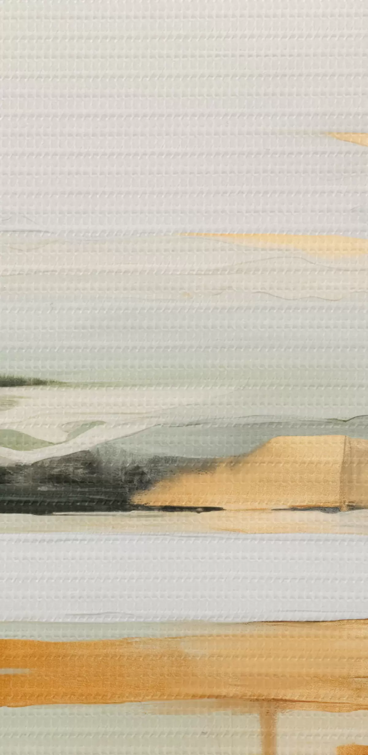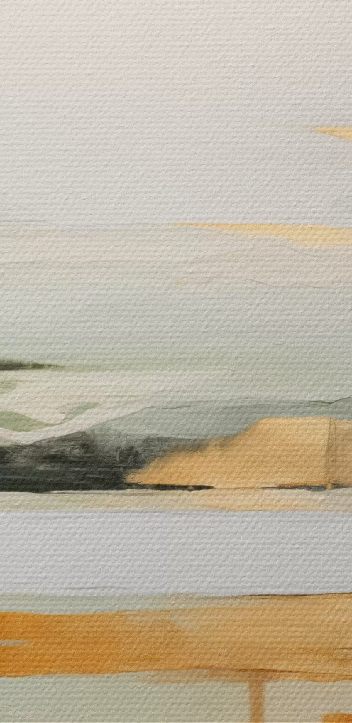 Quadri Paesaggio astratto con accenti gialli, una composizione minimalista di terra, acqua e cielo, con colori tenui Nr m00877
