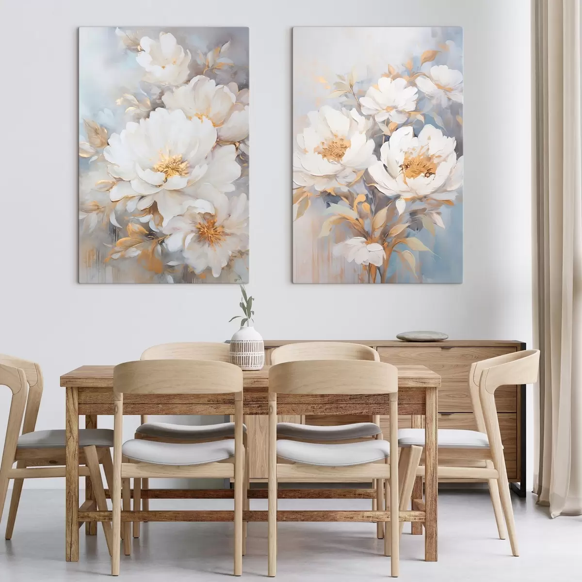 Quadri Peonie bianche con centro e foglie gialle, pennellate morbide, sfondo azzurro, composizione floreale Nr m00878