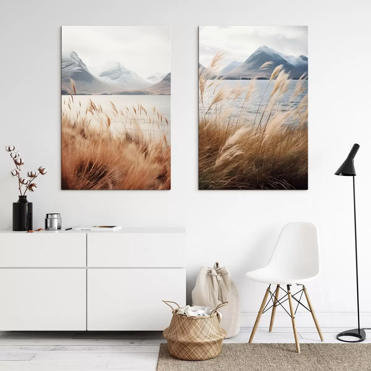 Quadri Erba della Pampa con un lago e montagne sullo sfondo, illuminazione soffusa, colori tenui, stile naturalistico Nr m00884