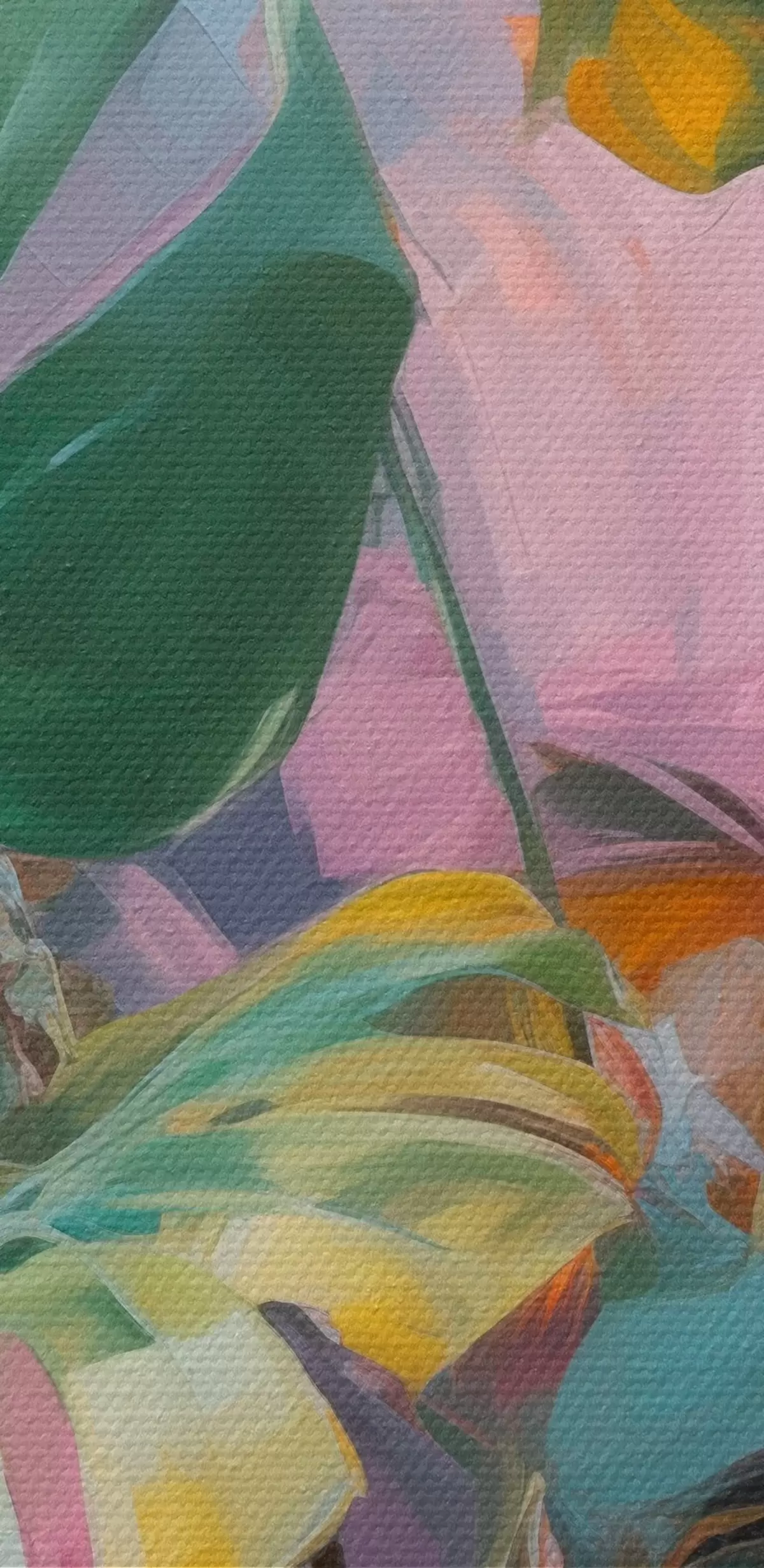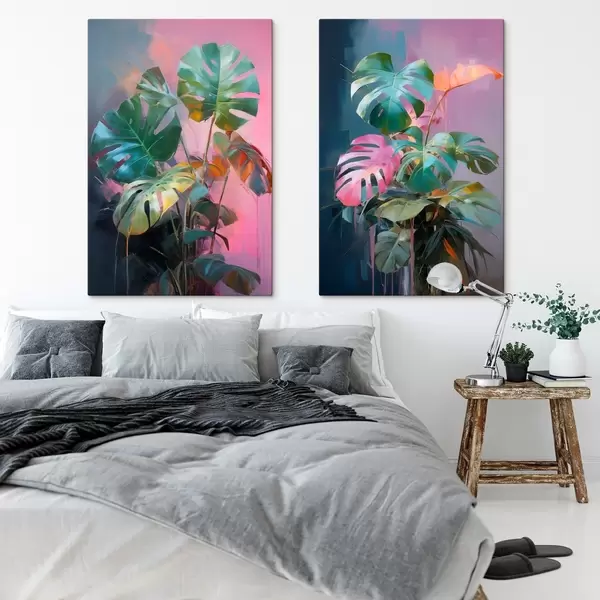 Quadri Pianta astratta di monstera con foglie verde brillante, su uno sfondo di delicate tonalità rosa e viola Nr m00886