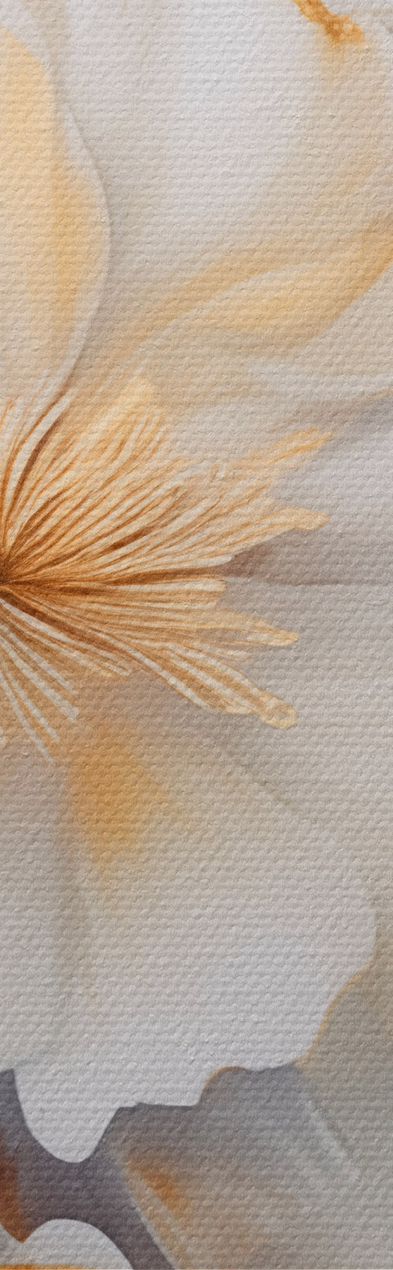 Quadri Fiori bianchi con dettagli gialli, petali con sfumature delicate, sfondo chiaro con sottile effetto marmorizzato Nr m00889