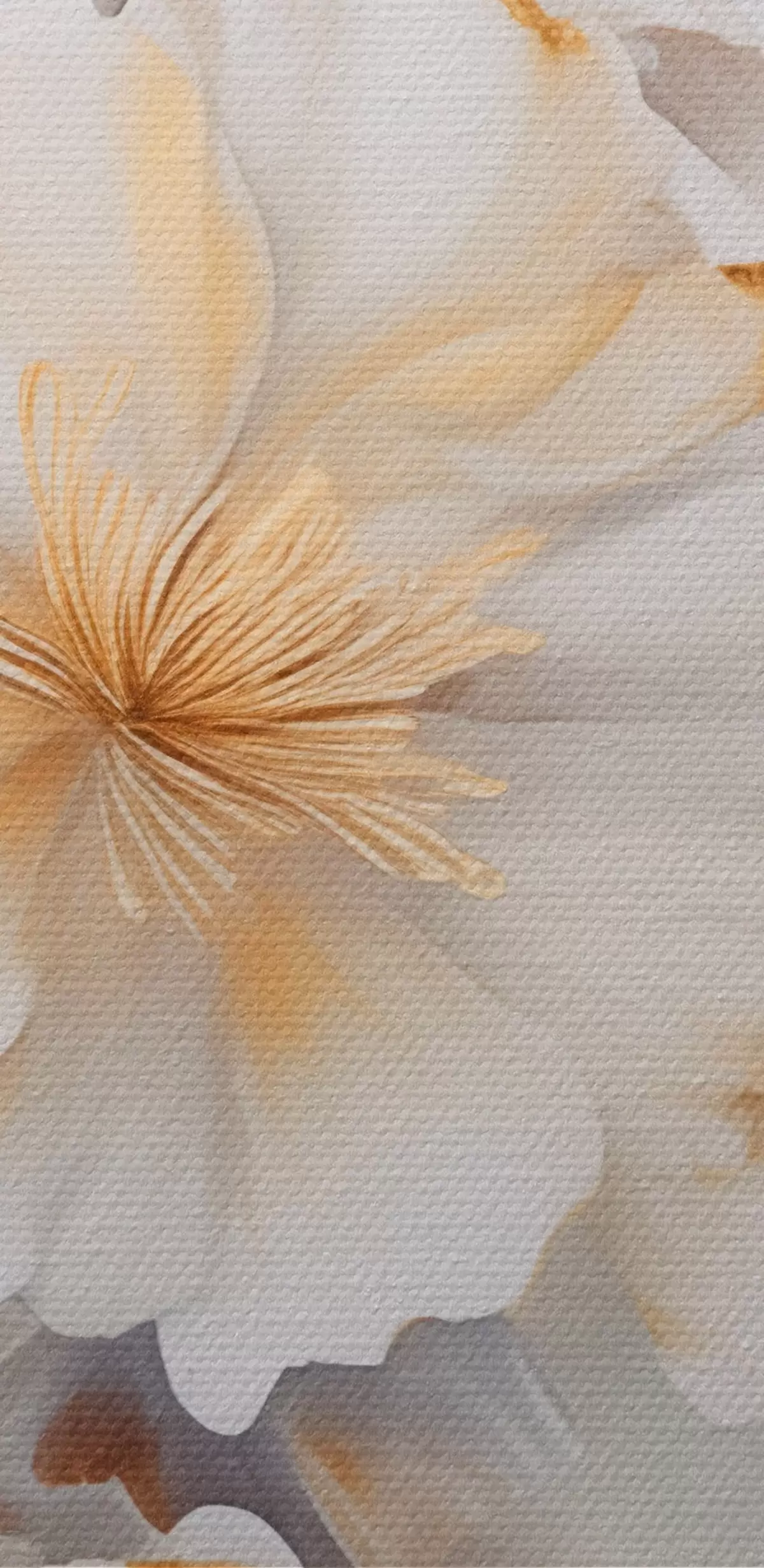 Quadri Fiori bianchi con dettagli gialli, petali con sfumature delicate, sfondo chiaro con sottile effetto marmorizzato Nr m00889