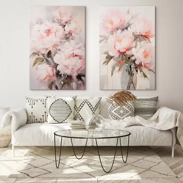 Quadri Un bouquet di peonie rosa chiaro con foglie verdi, pennellate morbide, colori pastello, su uno sfondo chiaro Nr m00890