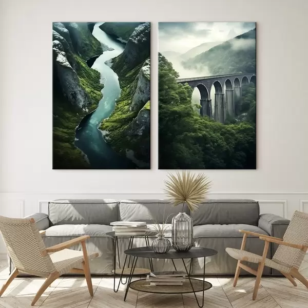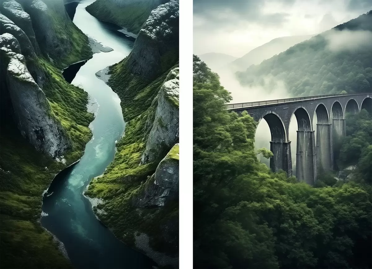 carta da parati Canyon fluviale aereo e viadotto nebbioso tra verdi colline nr. m00967