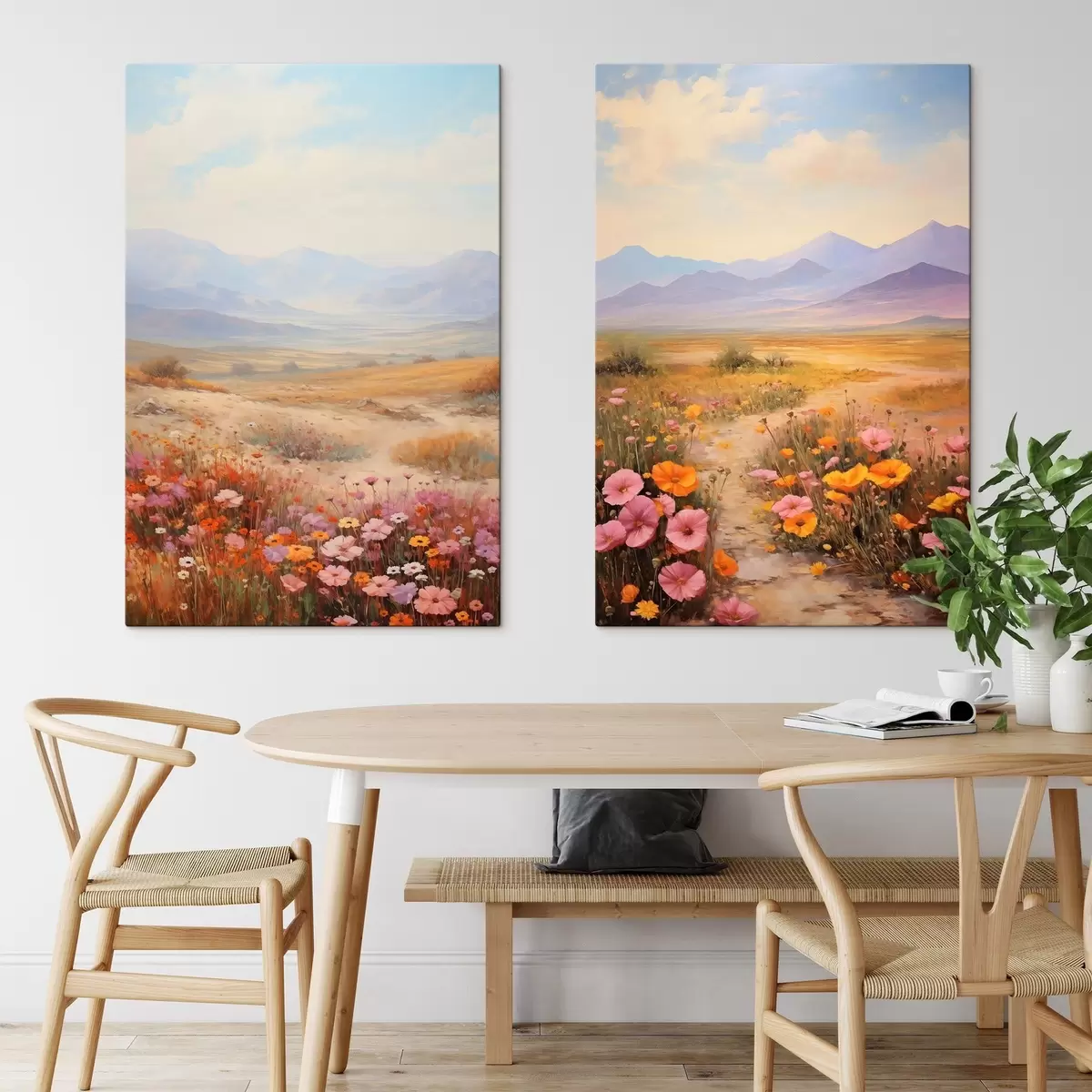 Quadri Paesaggio, un campo di fiori colorati con le montagne sullo sfondo, colori tenui e pastello Nr m01003