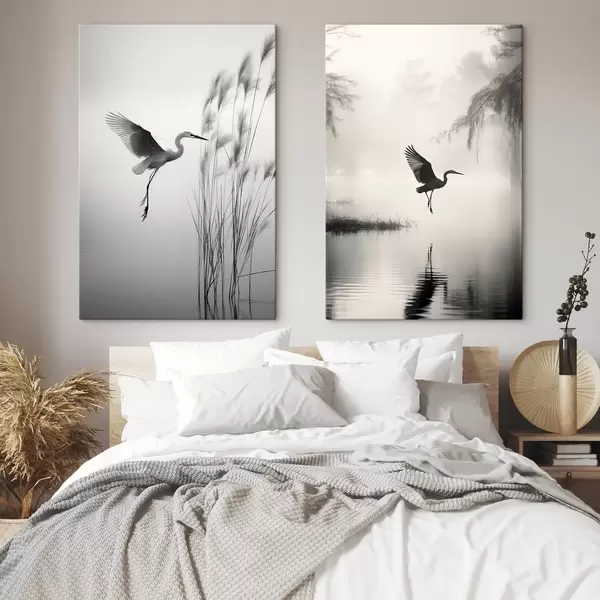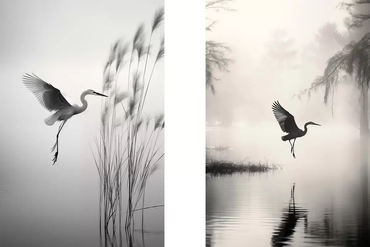 Quadri Un airone bianco con le ali spiegate, che vola vicino ad alte canne, composizione minimalista in bianco e nero Nr m01007
