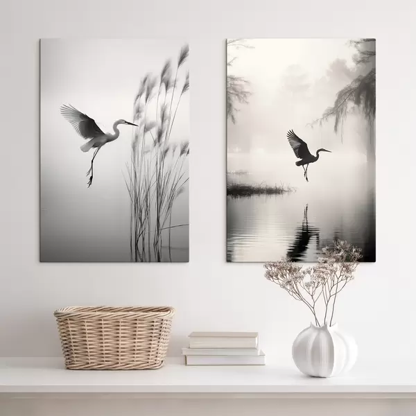 Quadri Un airone bianco con le ali spiegate, che vola vicino ad alte canne, composizione minimalista in bianco e nero Nr m01007